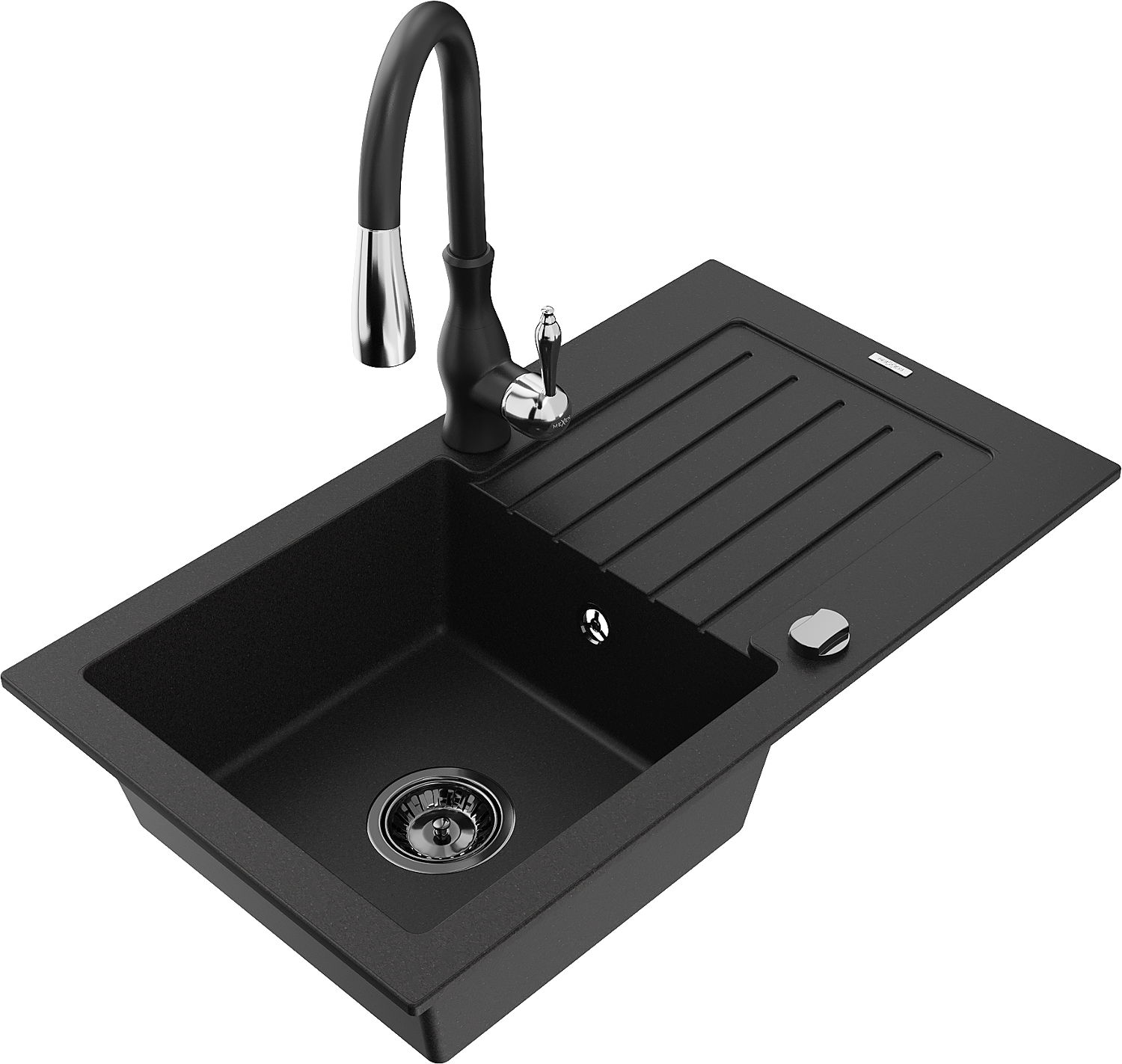 Mexen Pablo gránit mosogató 1-medencés, csepegtetővel és Savita konyhai csappal, fekete - 6510-77-672601-70-B