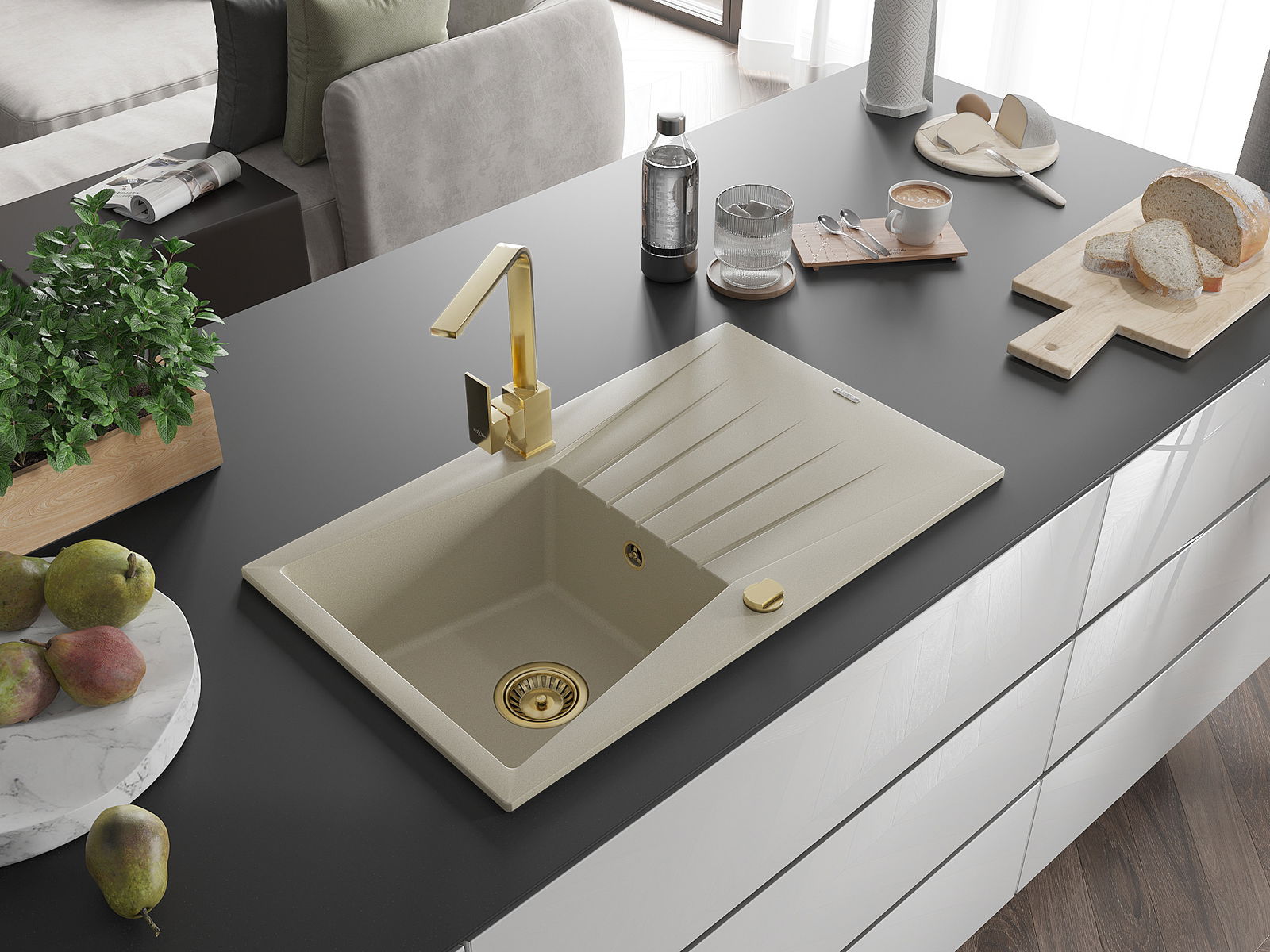 A mosogató kiváló minőségű gránitból készül. Ez egy elegáns és mindenekelőtt minden konyhához praktikus kiegészítés, stílusától függetlenül. A kiváló minőségű és a gránit tartósság biztosítja a sok éves használatát.
