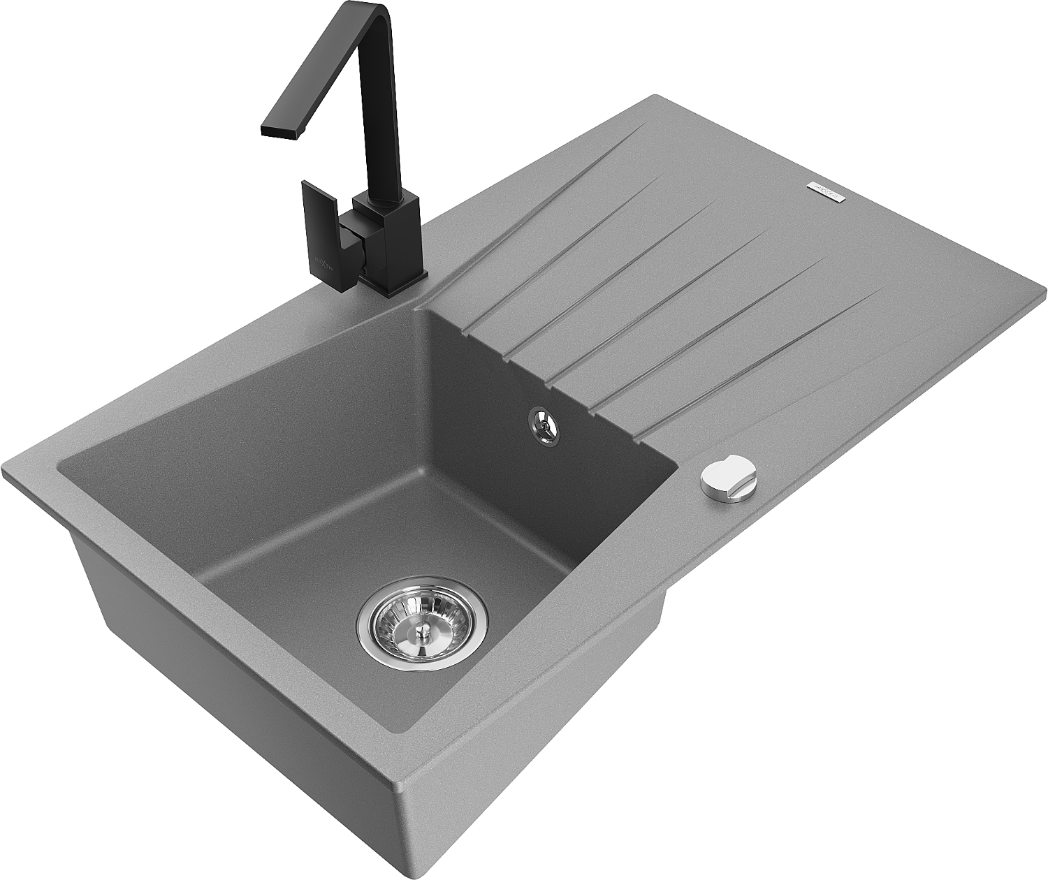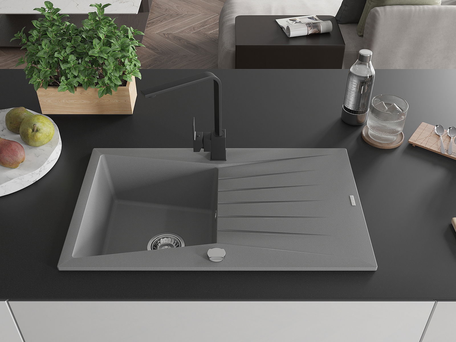 Mexen Cesar gránit mosogató 1-medencés csepegtető felülettel és Rita konyhai csapteleppel, szürke - 6514-71-670300-70