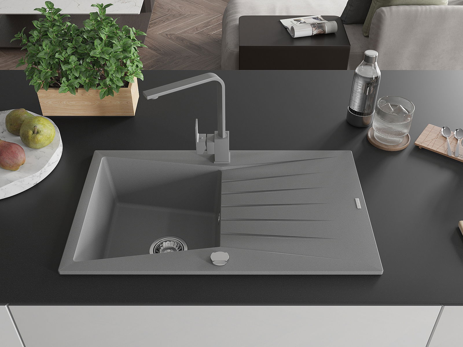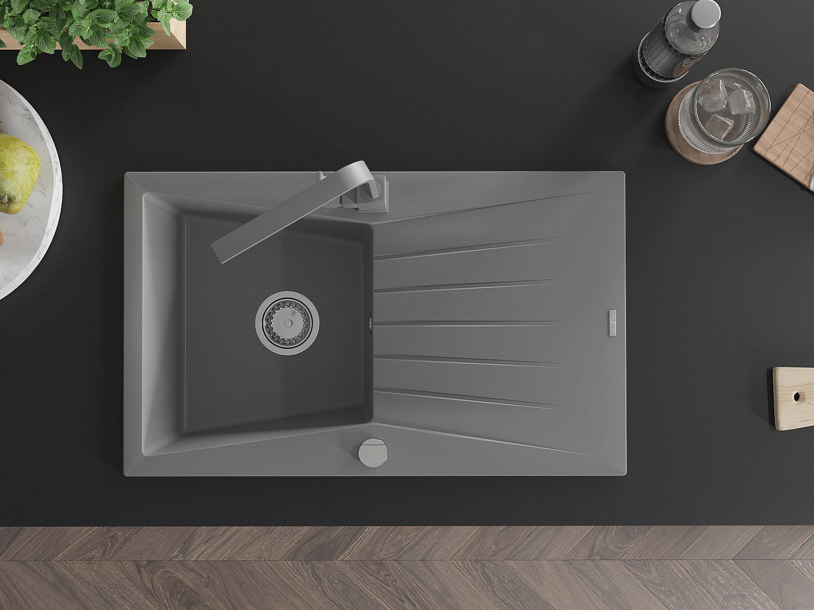 A mosogató magas minőségű gránitból készült. Elegáns, de mindenekelőtt praktikus kiegészítője minden konyhának, függetlenül annak stílusától. A gránit magas minősége és tartóssága hosszú távú használatot biztosít.
