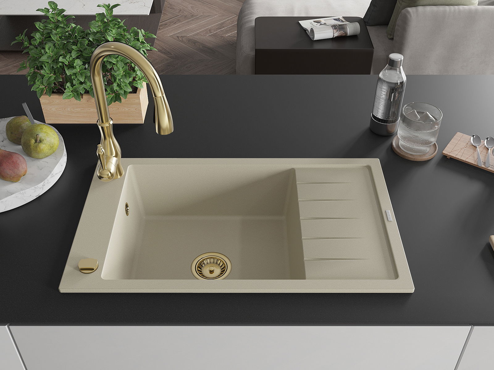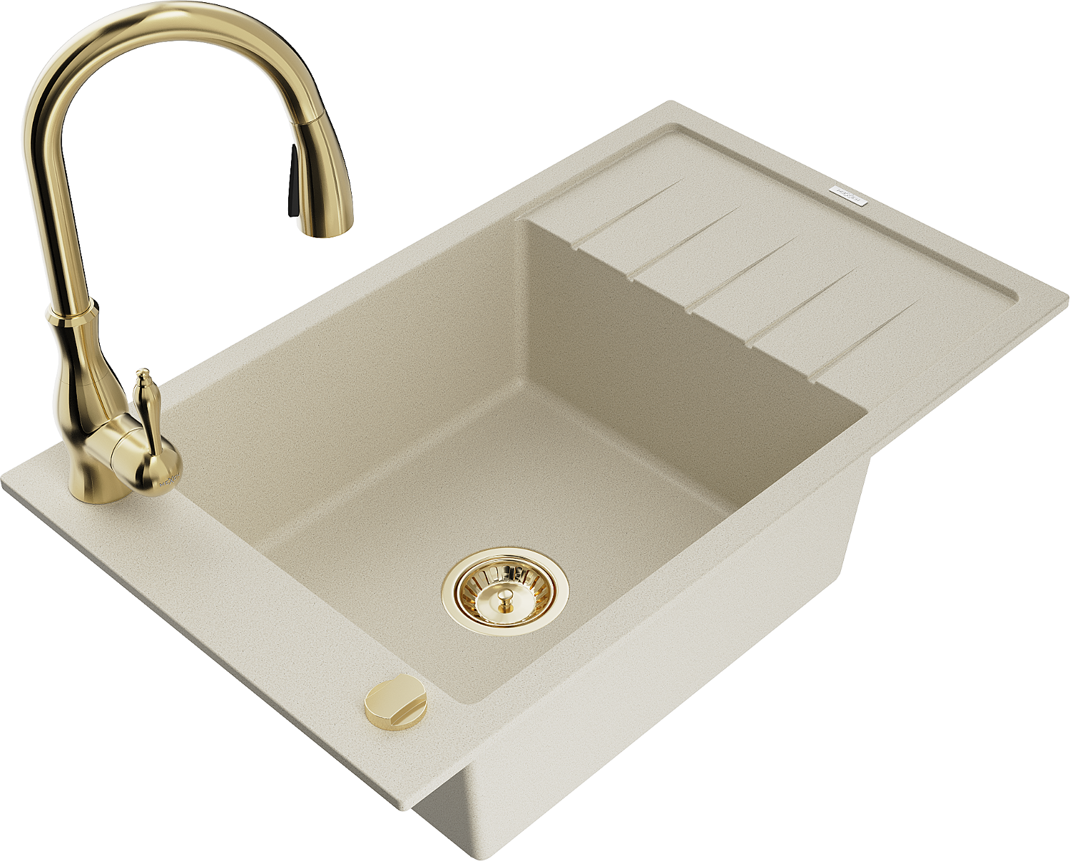 Mexen Elias egykamrás gránit mosogató csepegtetővel és Savita konyhai csapteleppel, bézs - 6511-69-672601-50