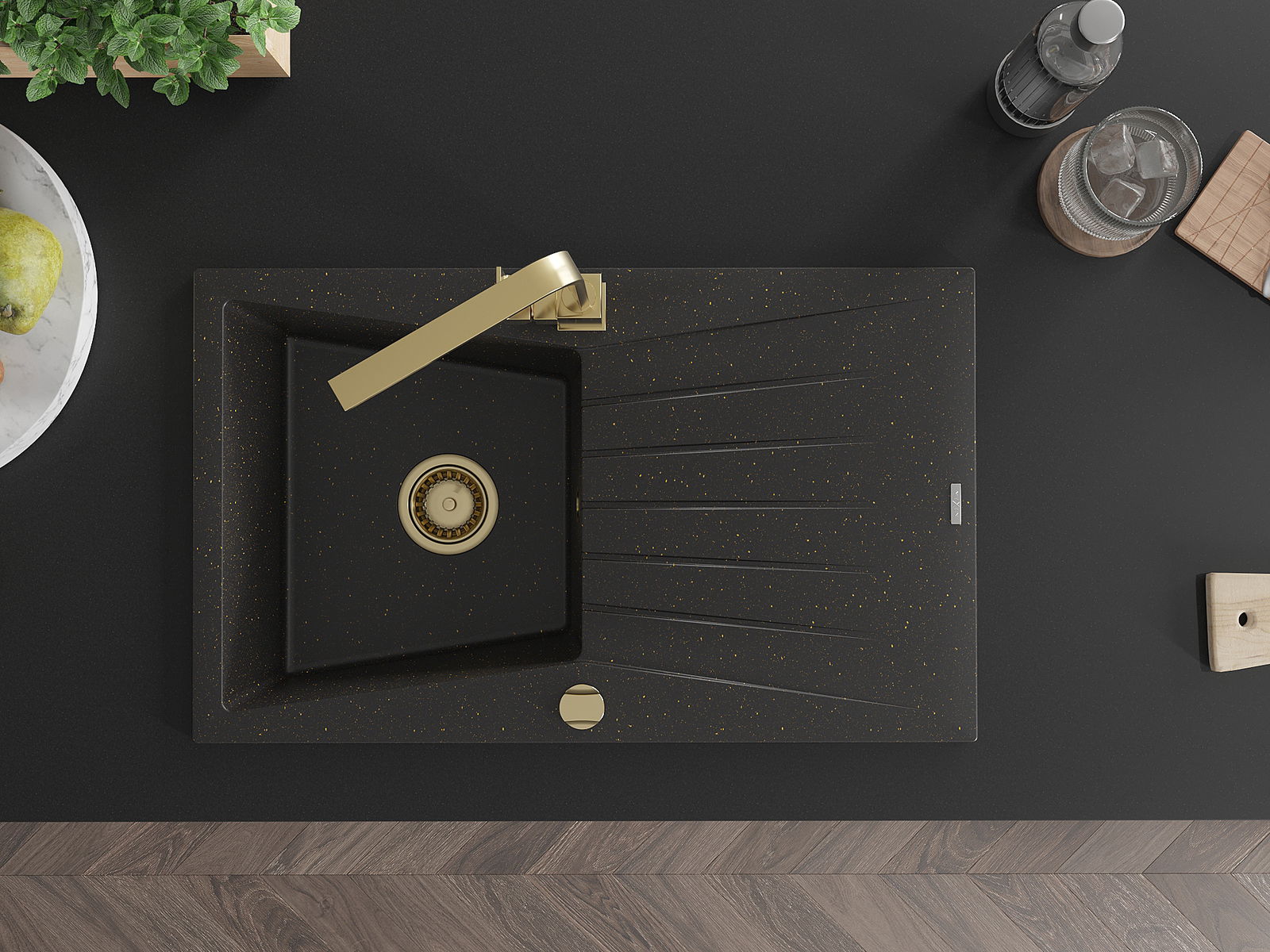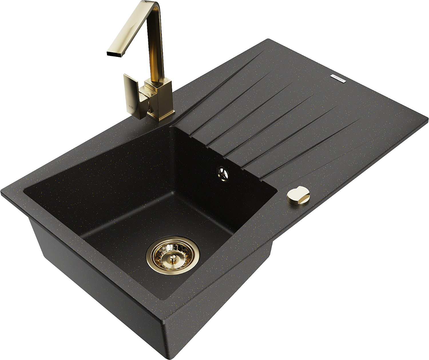 Mexen Cesar 1-kamrás gránit mosogató csepegtetővel és Rita konyhai csapteleppel, fekete/arany metál - 6514-75-670300-50
