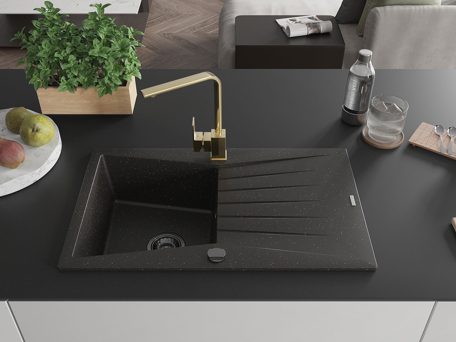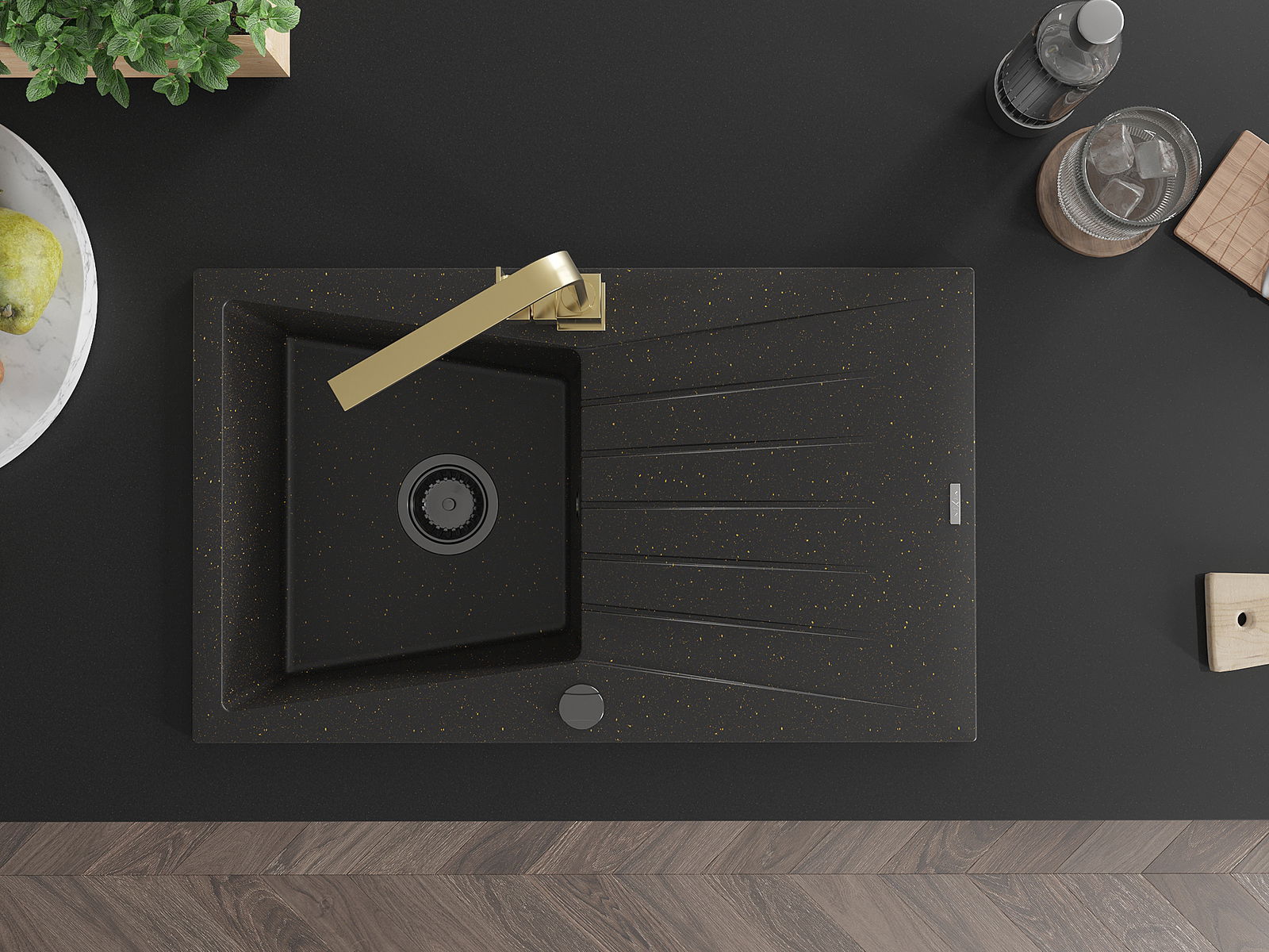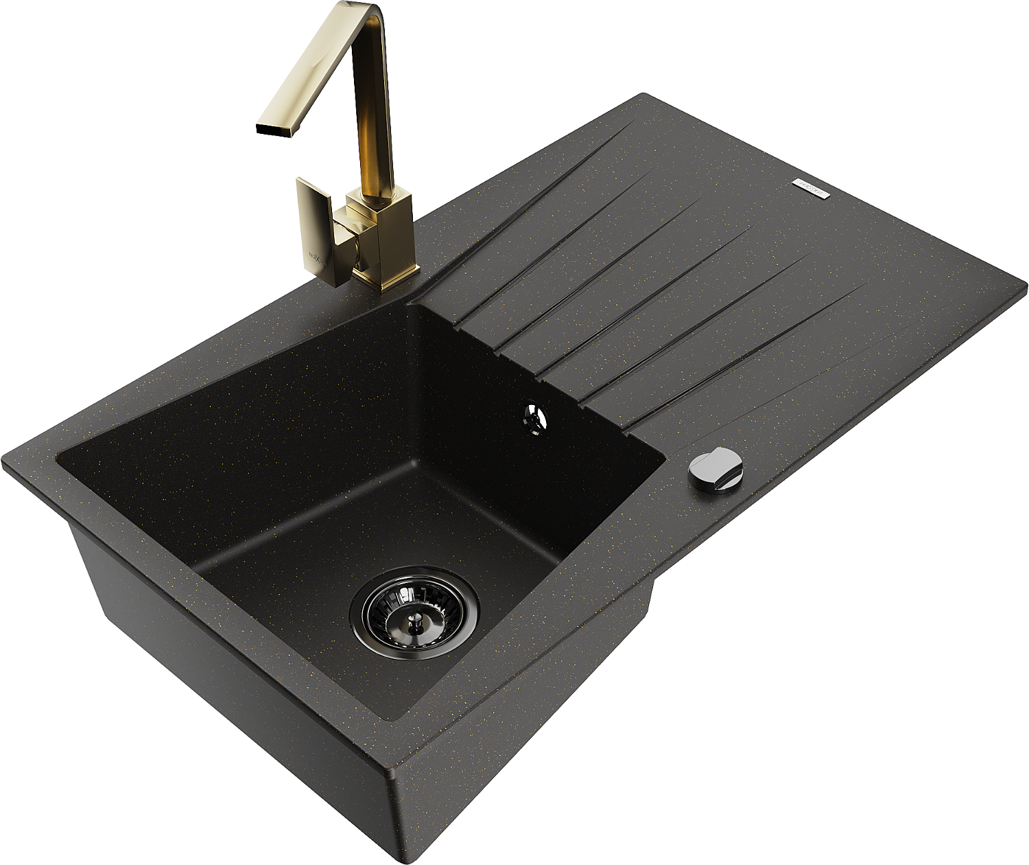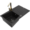 Mexen Cesar 1 rekeszes gránit mosogató csepegtetővel és Rita konyhai csapteleppel, fekete/arany metál - 6514-75-670300-50-B