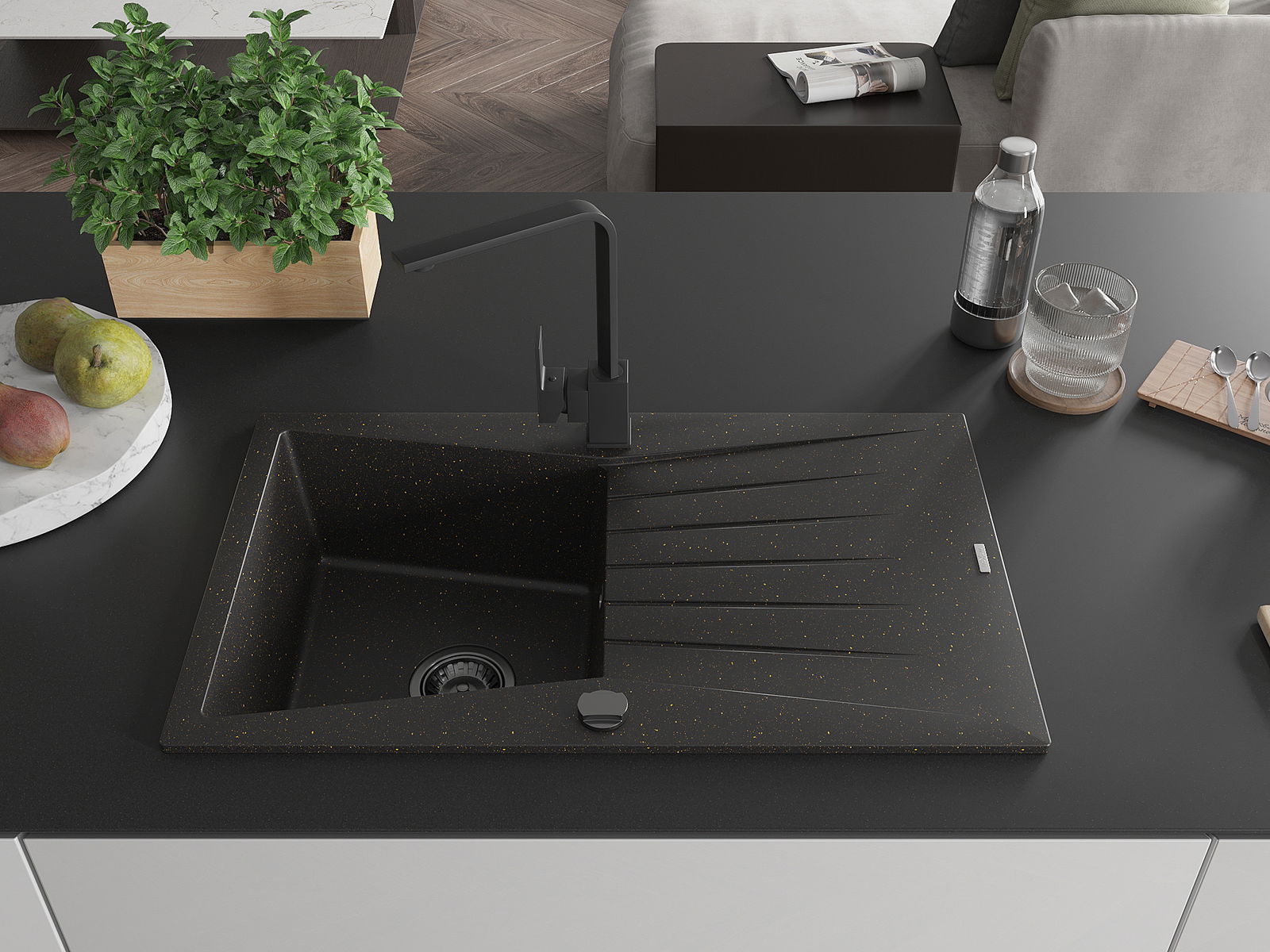 Mexen Cesar egymedencés gránit mosogató csepegtetővel és Rita konyhai csapteleppel, fekete/arany metál - 6514-75-670300-70-B