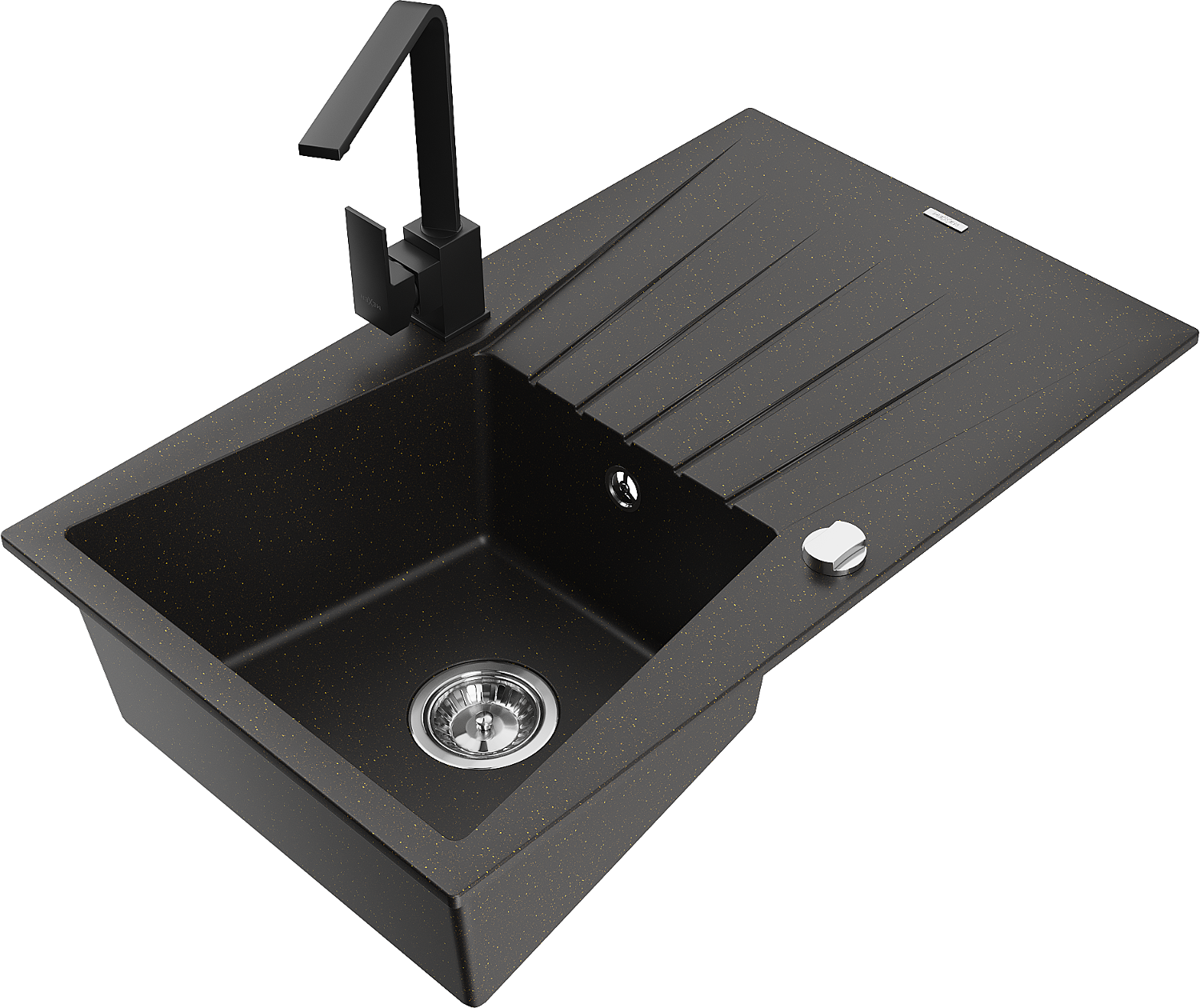 Mexen Cesar 1-kamrás gránit mosogatótálca csepegtetővel és Rita konyhai csapteleppel, fekete/arany metál - 6514-75-670300-70