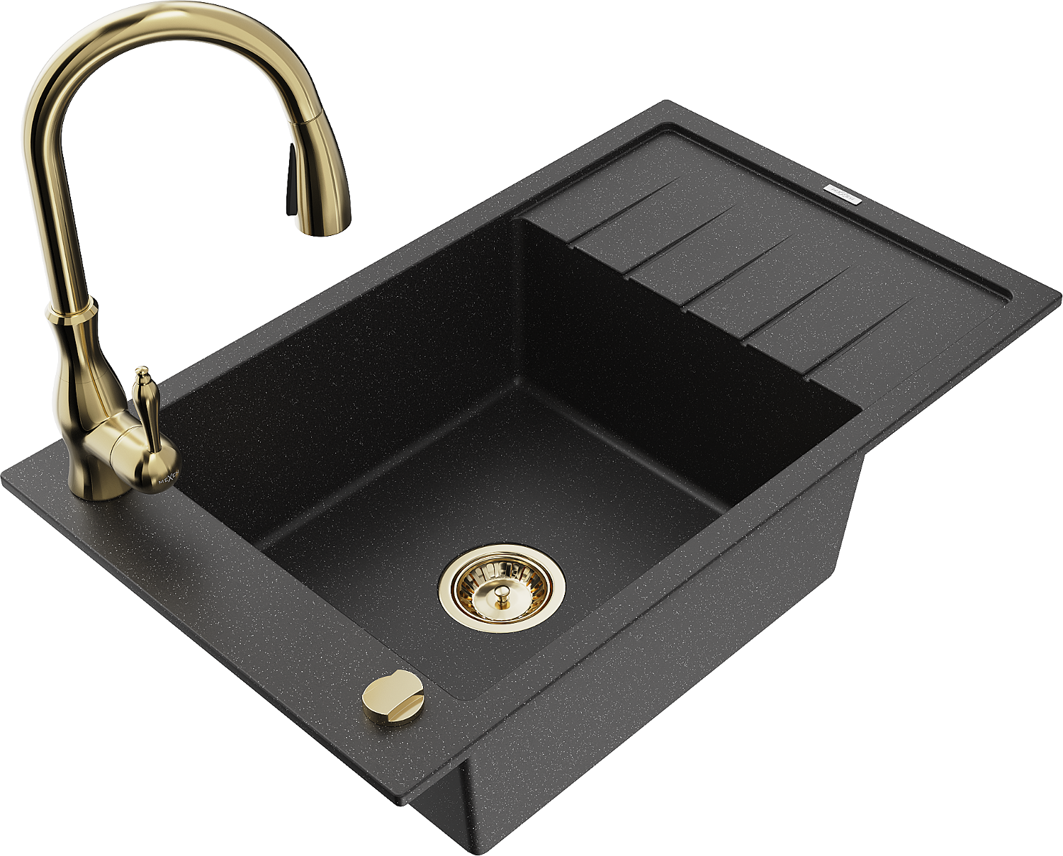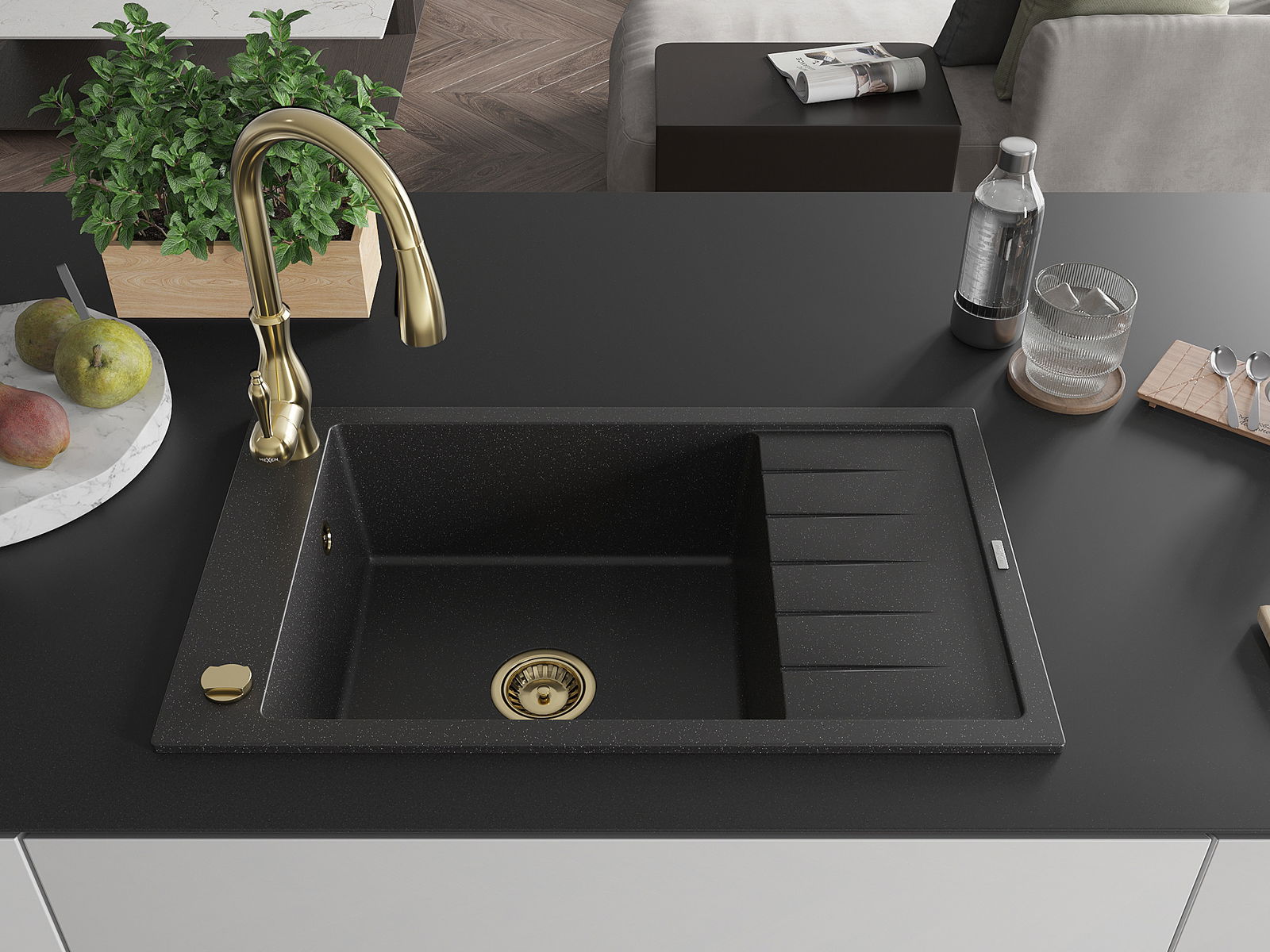Mexen Elias egykamrás gránit mosogató csepegtetővel és Savita konyhai csapteleppel, fekete/ezüst metál - 6511-73-672601-50