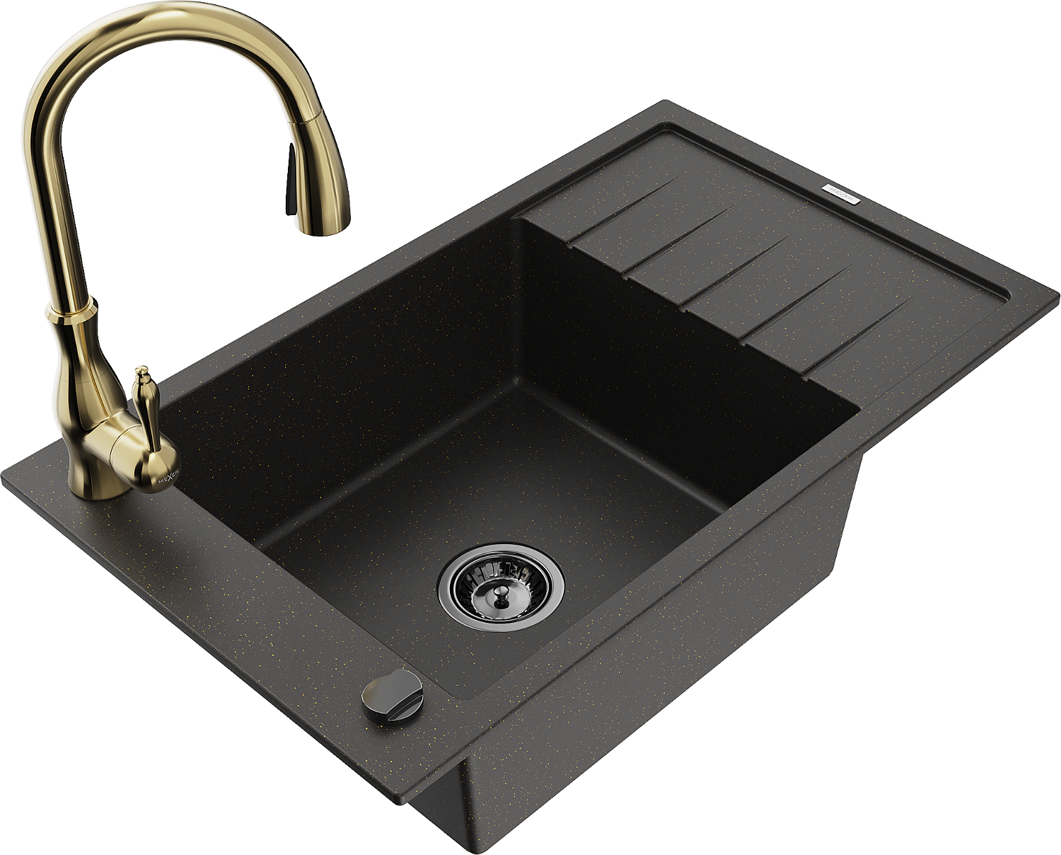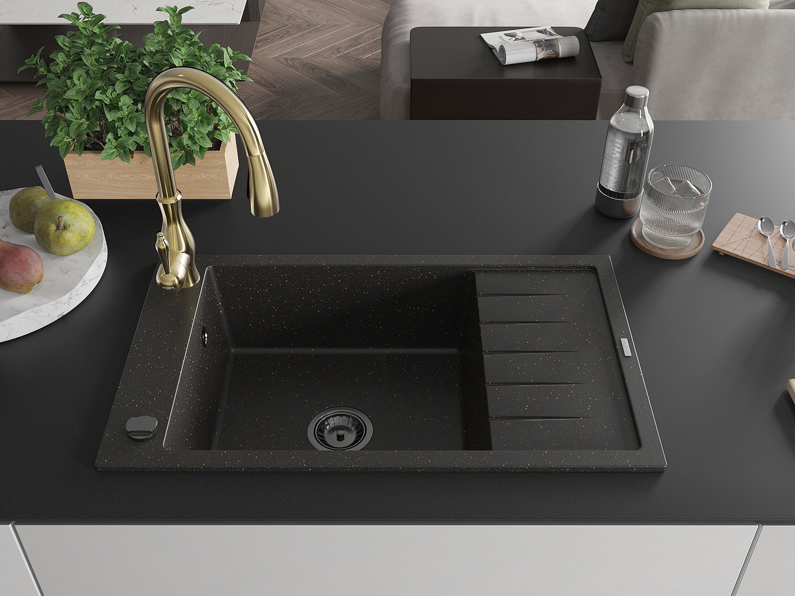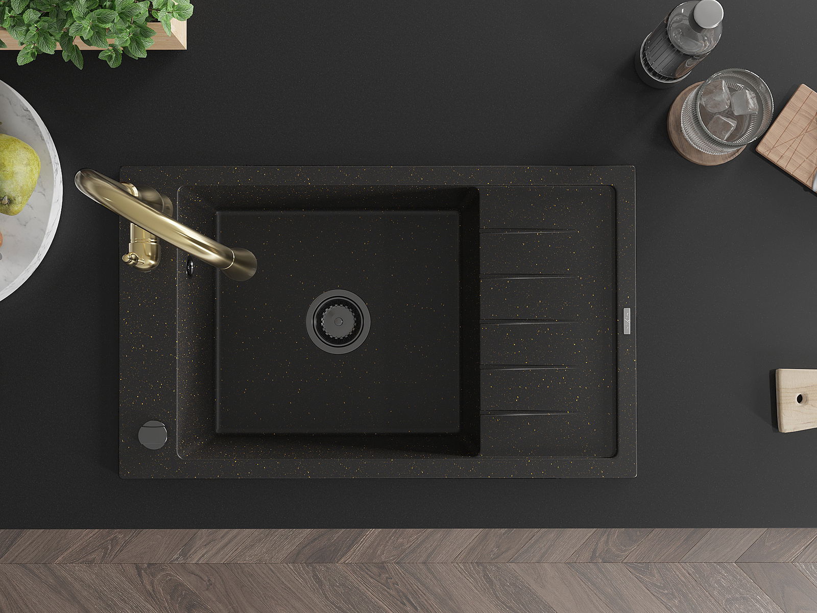 Mexen Elias 1-medencés gránit mosogató csepegtetővel és Savita konyhai csappal, fekete/arany metál - 6511-75-672601-50-B