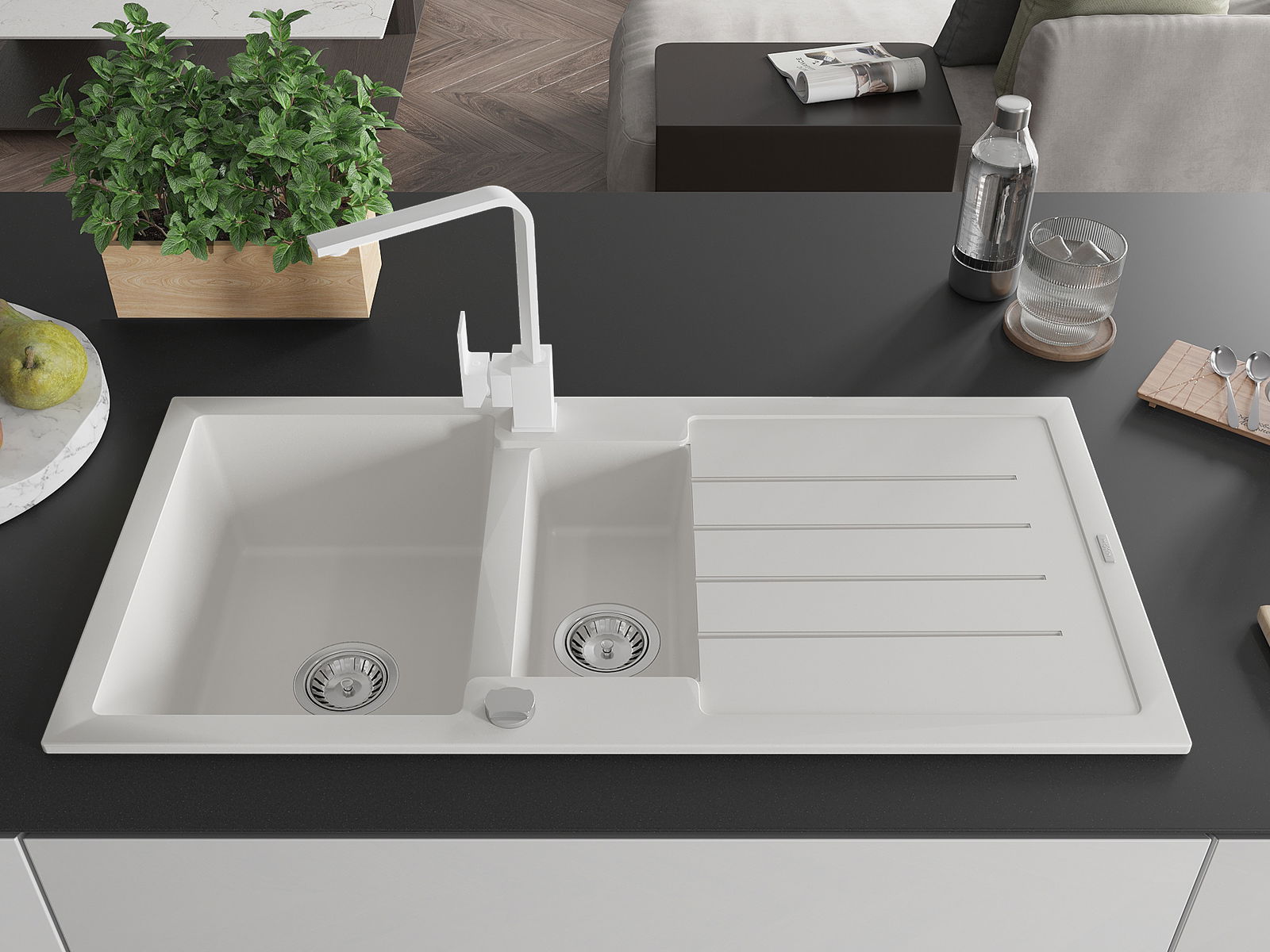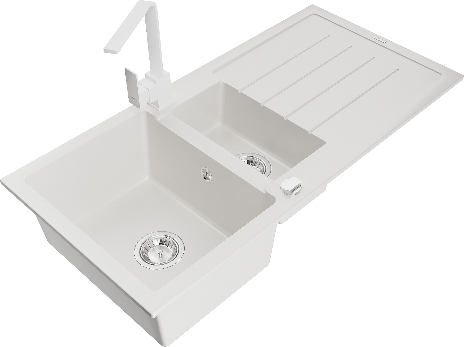 Mexen Andres gránit mosogató 1,5-medencés csepegtetővel és Rita konyhai csapteleppel, fehér - 6515-20-670300-20
