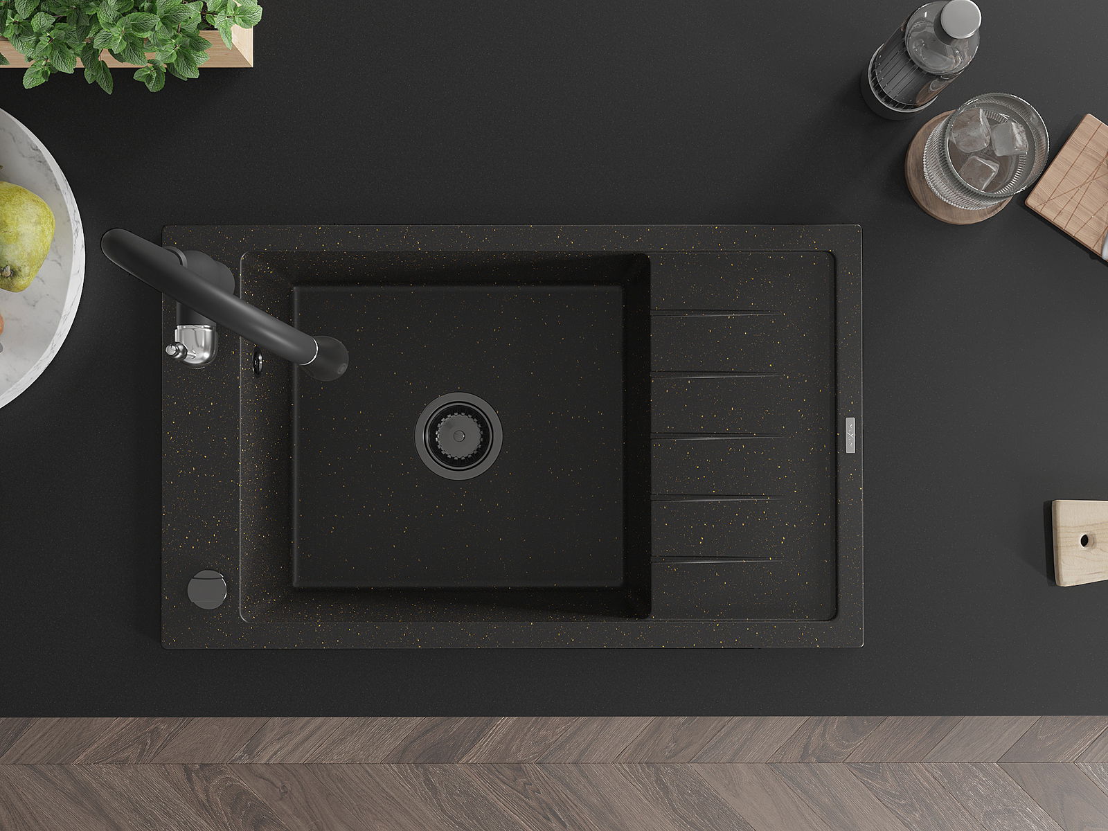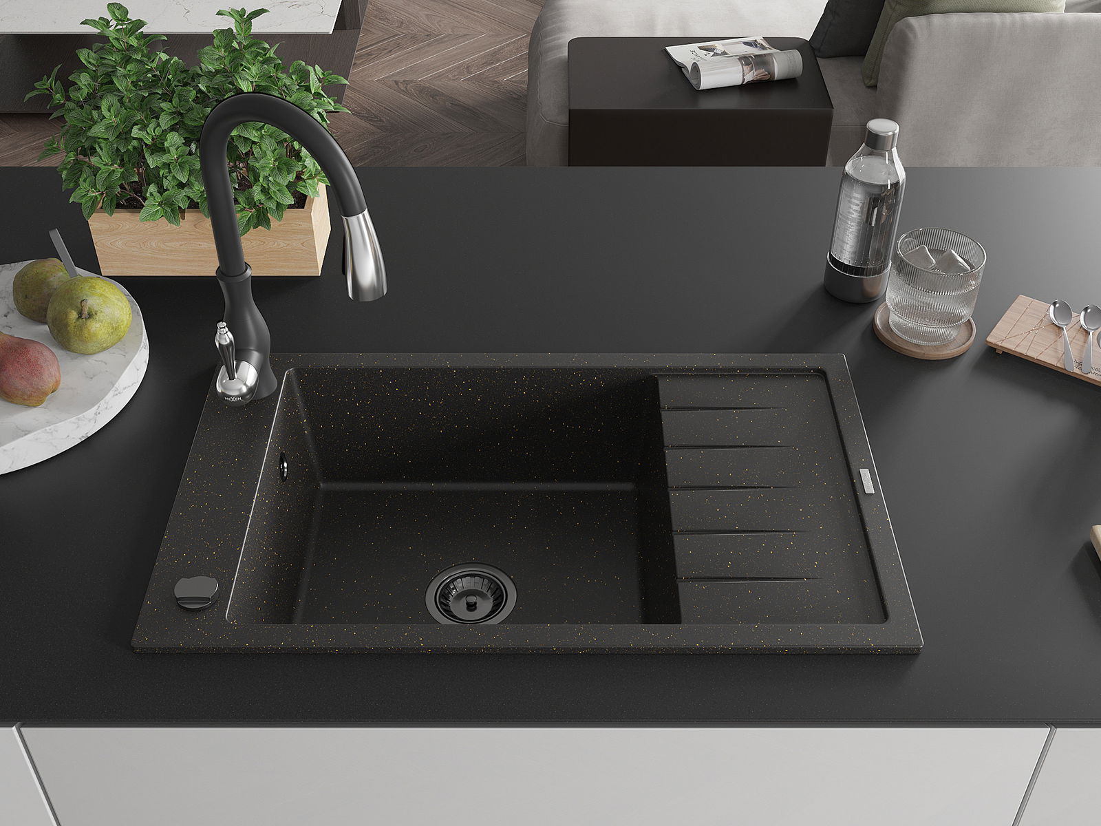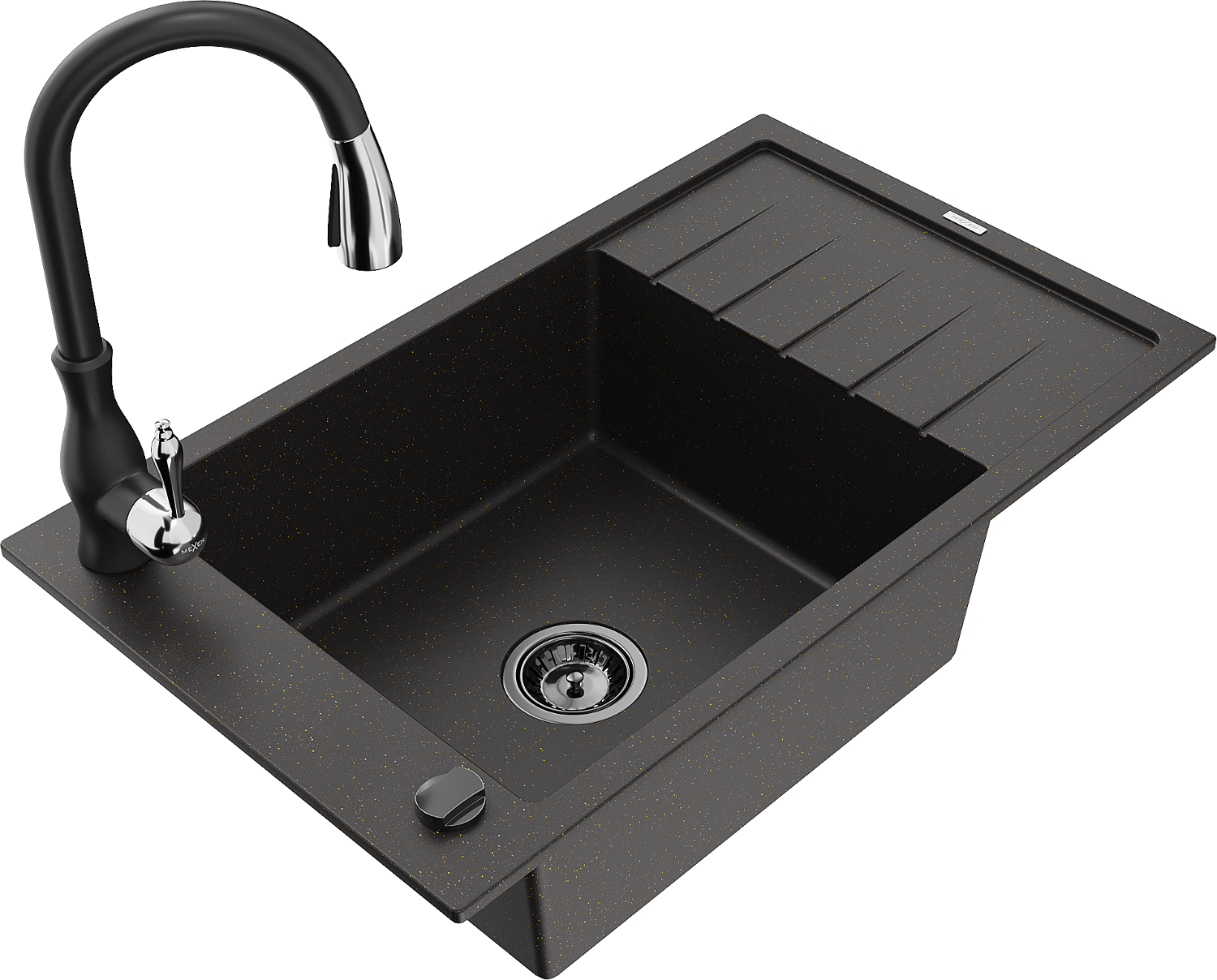 Mexen Elias gránit egykamrás mosogató csepegtetővel és Savita konyhai csapteleppel, fekete/arany metál - 6511-75-672601-70-B