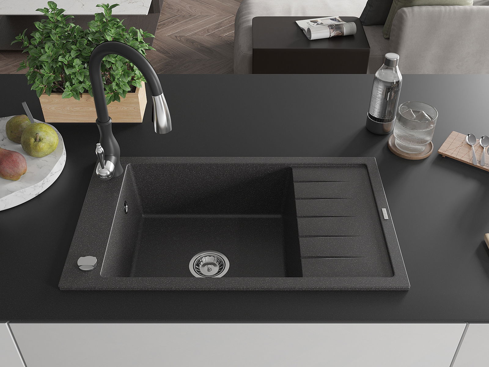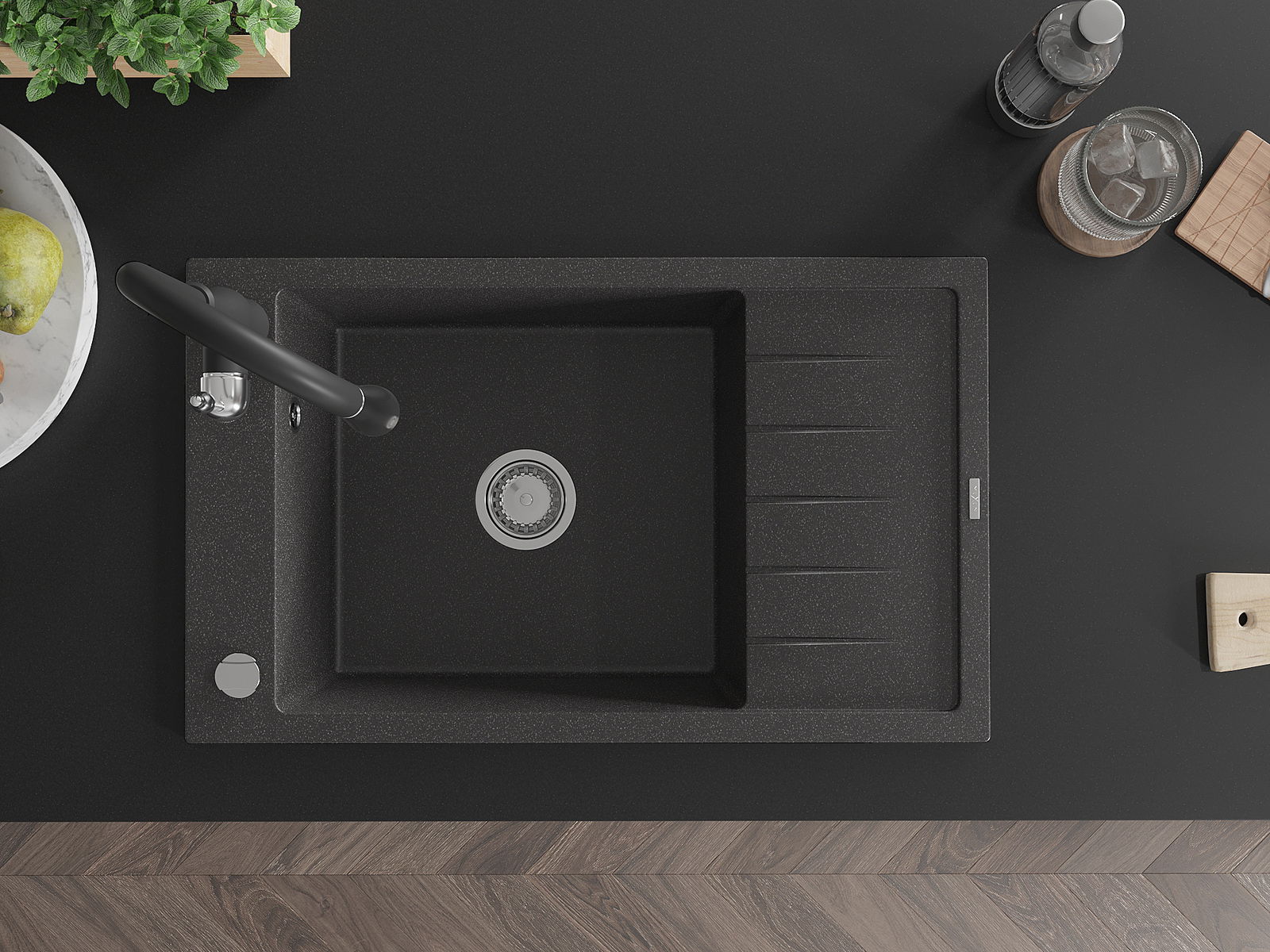 Mexen Elias egymedencés gránit mosogató csepegtetővel és Savita konyhai csapteleppel, fekete pöttyös - 6511-76-672601-70