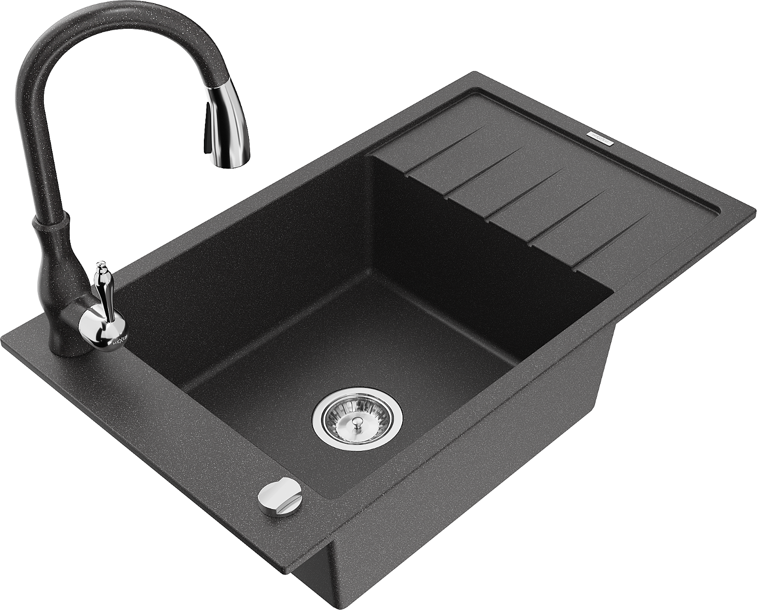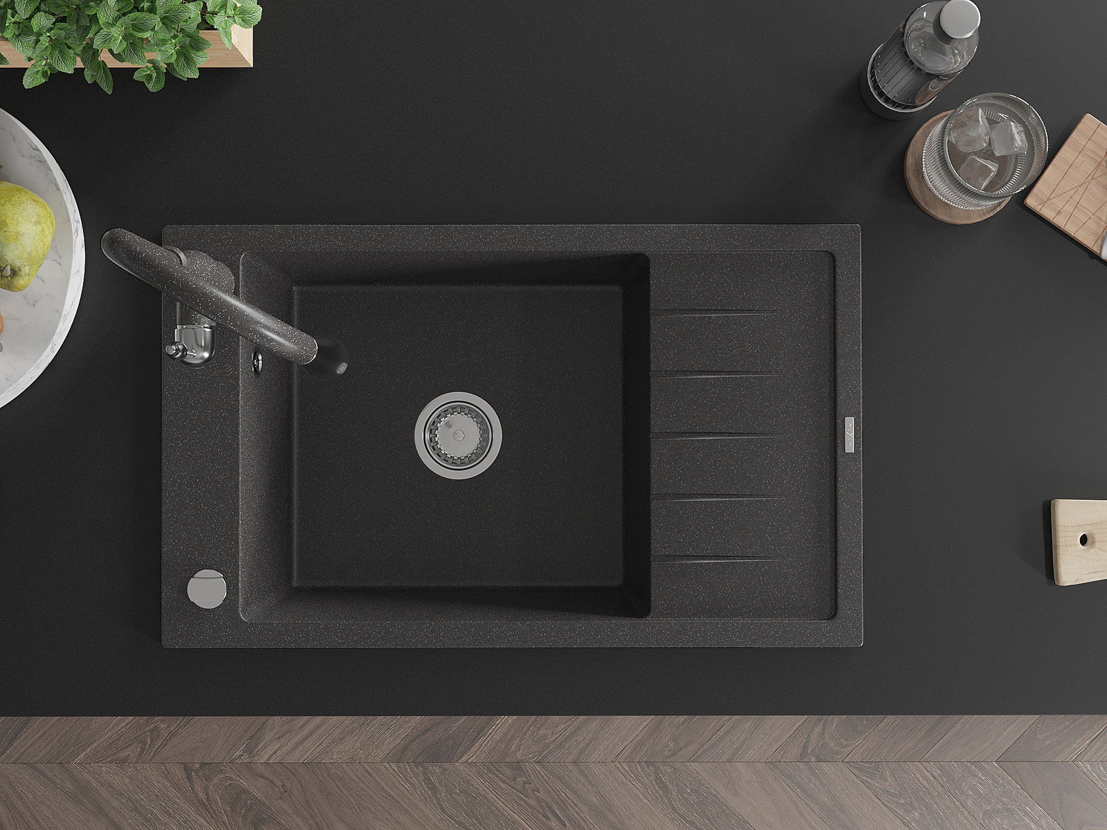 Mexen Elias gránit mosogató 1-medencés csepegtetővel és Savita konyhai csappal, fekete pöttyös - 6511-76-672601-76