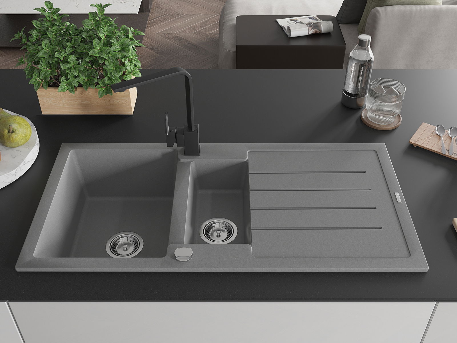 Mexen Andres 1,5 rekeszes gránit mosogató csöpögtetővel és Rita konyhai csapteleppel, szürke - 6515-71-670300-70