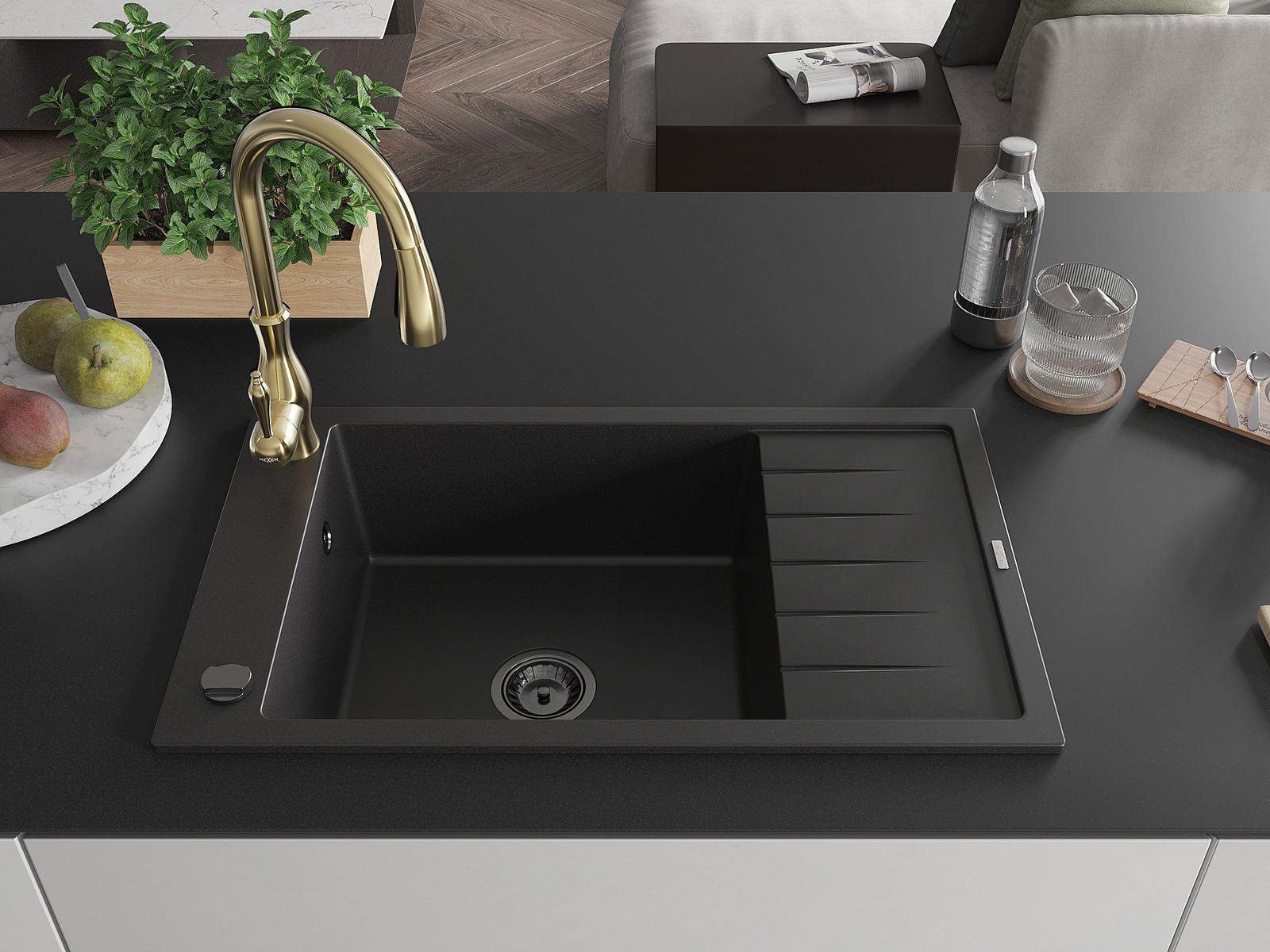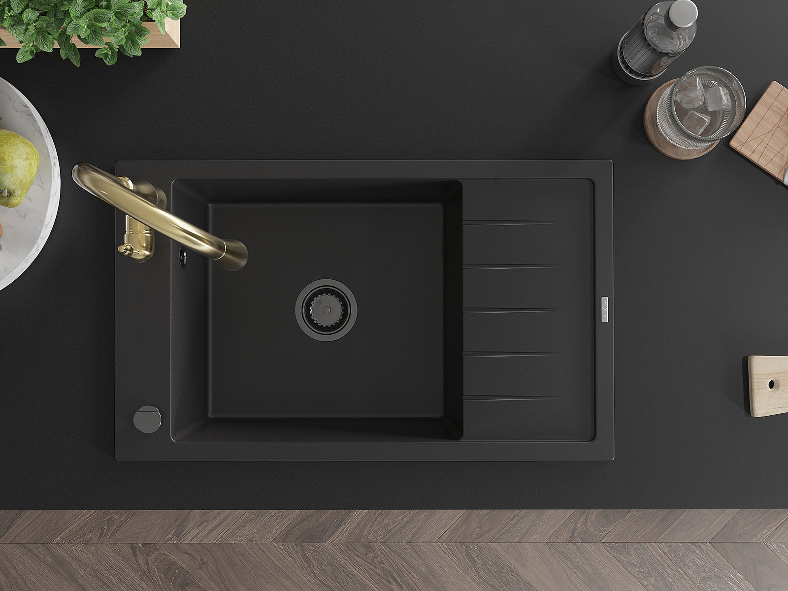 Mexen Elias egymedencés gránit mosogató csepegtetővel és Savita konyhai csapteleppel, fekete - 6511-77-672601-50-B