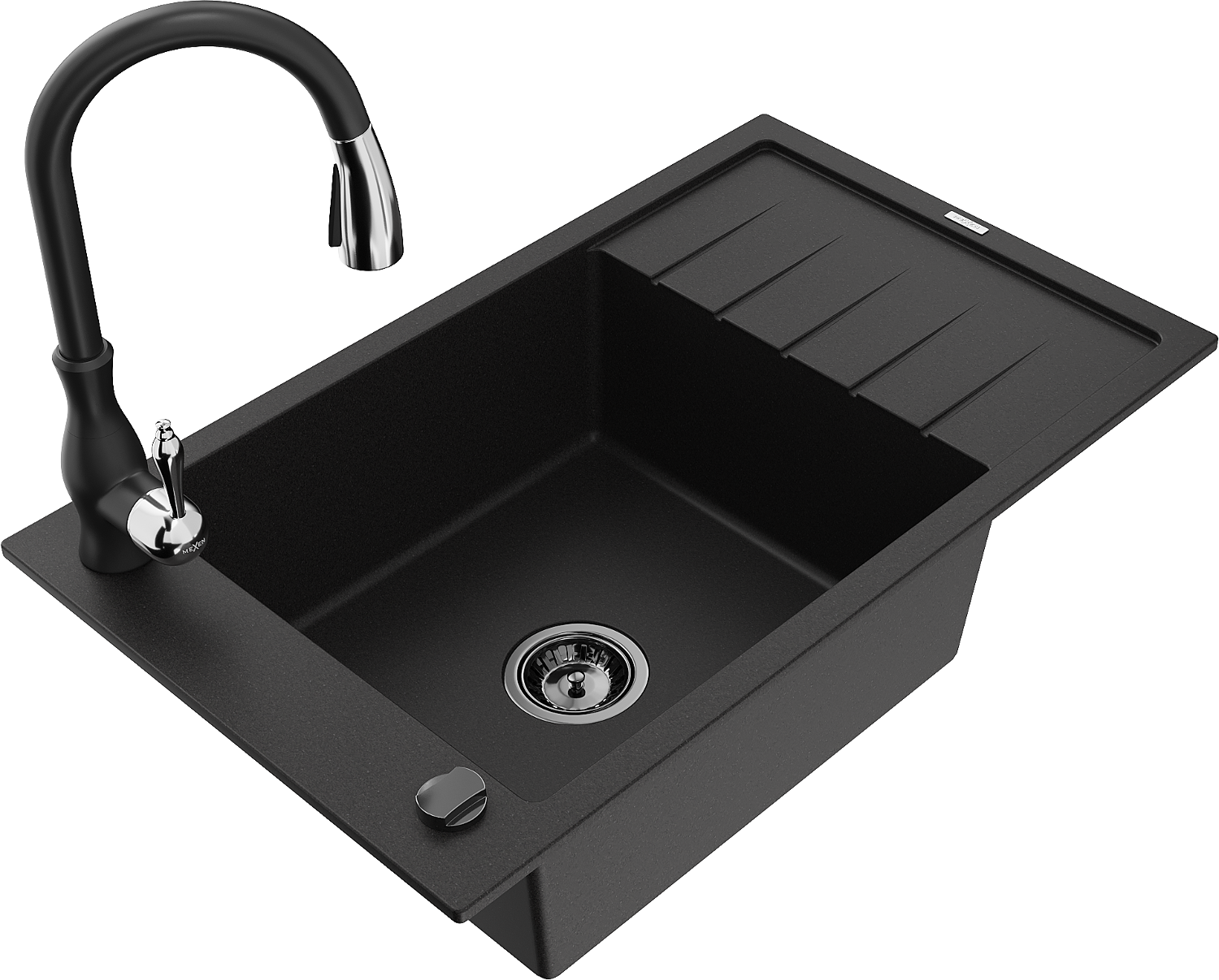 Mexen Elias 1-kamrás gránit mosogató csepegtetővel és Savita konyhai csappal, fekete - 6511-77-672601-70-B