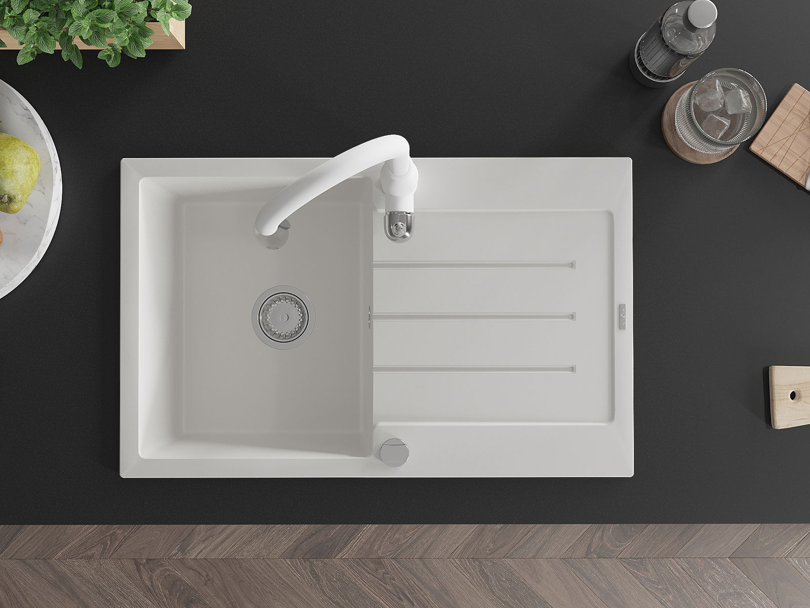 Mexen Bruno 1-medencés gránit mosogató csepptálcával és Savita konyhai csapteleppel, fehér - 6513-20-672601-20
