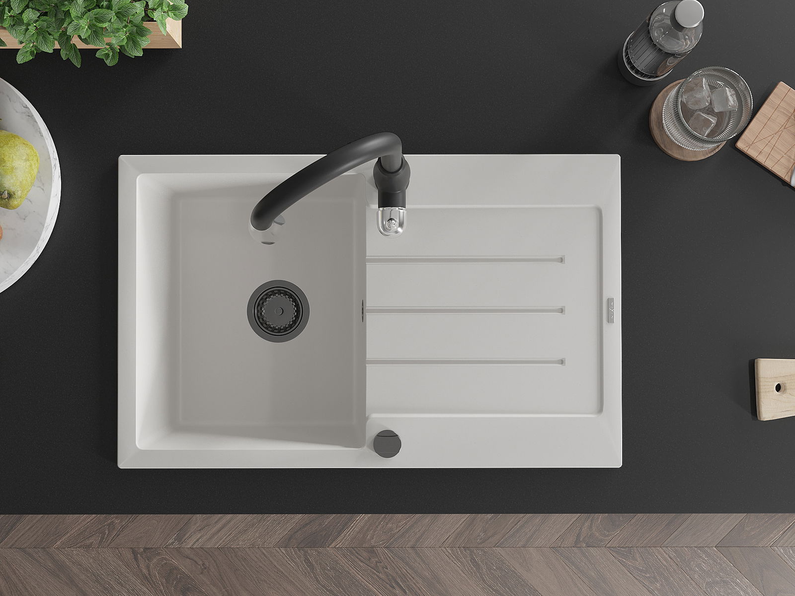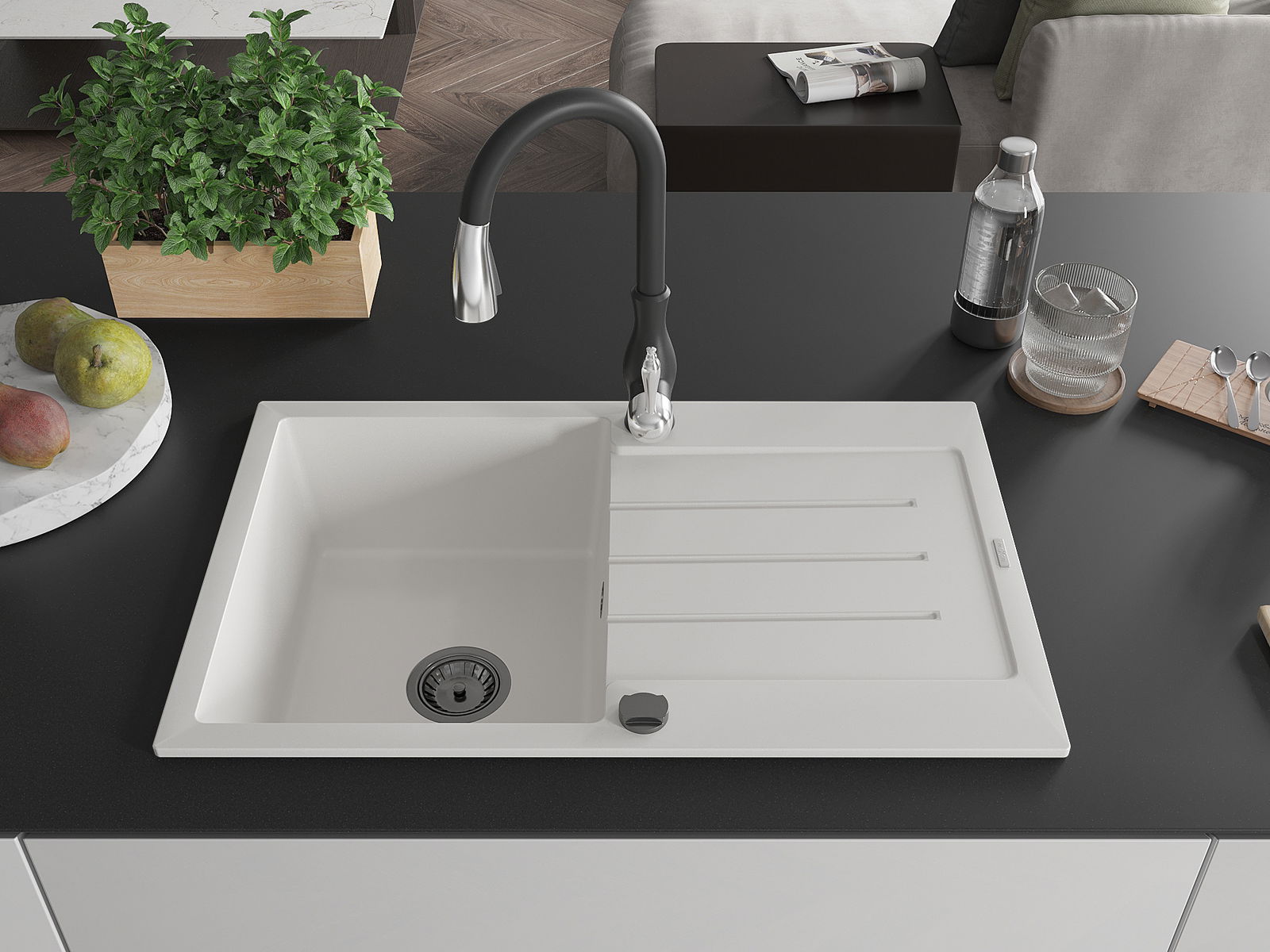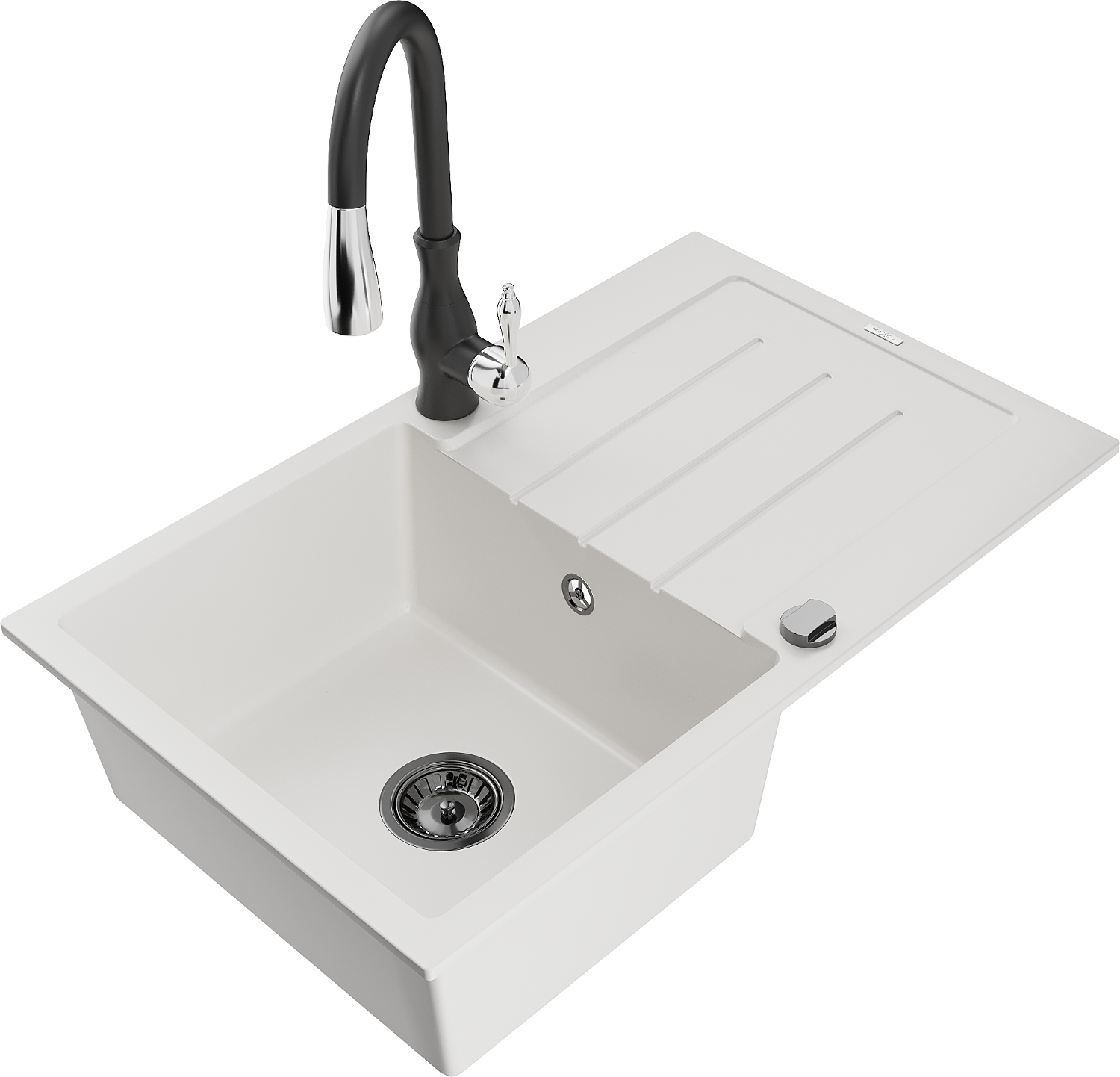 Mexen Bruno egykamrás gránit mosogató csepegtetővel és Savita konyhai csapteleppel, fehér - 6513-20-672601-70