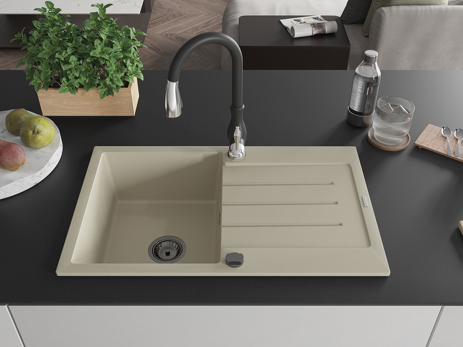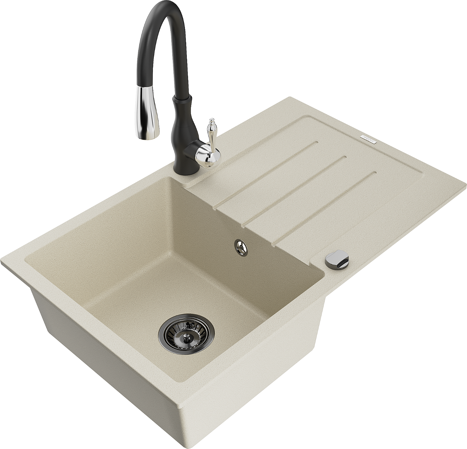 Mexen Bruno egymedencés gránit mosogató csepegtetővel és Savita konyhai csapteleppel, bézs - 6513-69-672601-70