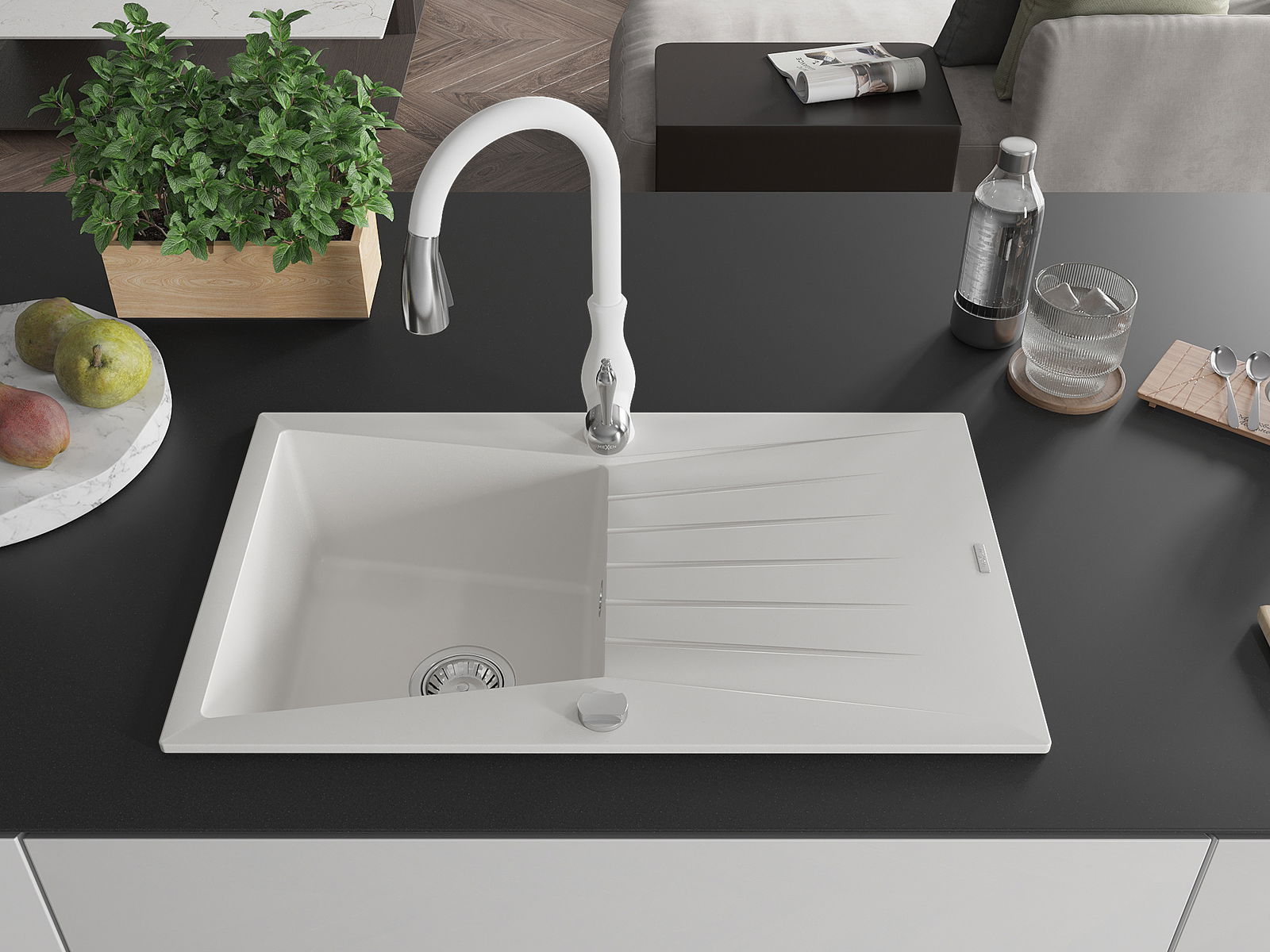 Mexen Cesar 1 rekeszes gránit mosogató vízelvezető tálcával és Savita konyhai csapteleppel, fehér - 6514-20-672601-20
