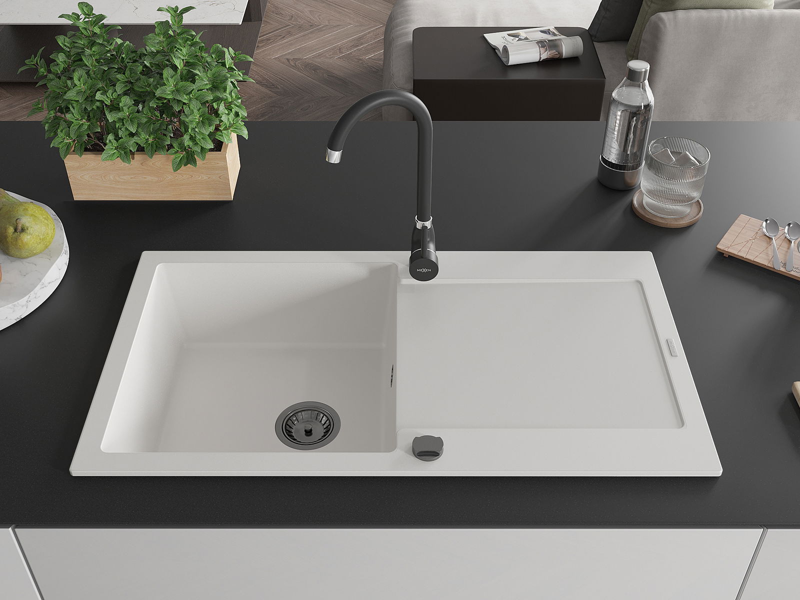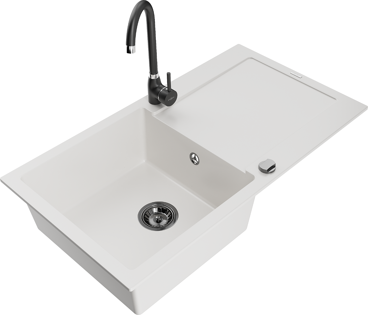 Mexen Leo egymedencés gránit mosogató csepegtetővel és Telma konyhai csapteleppel, fehér - 6501-20-670200-70