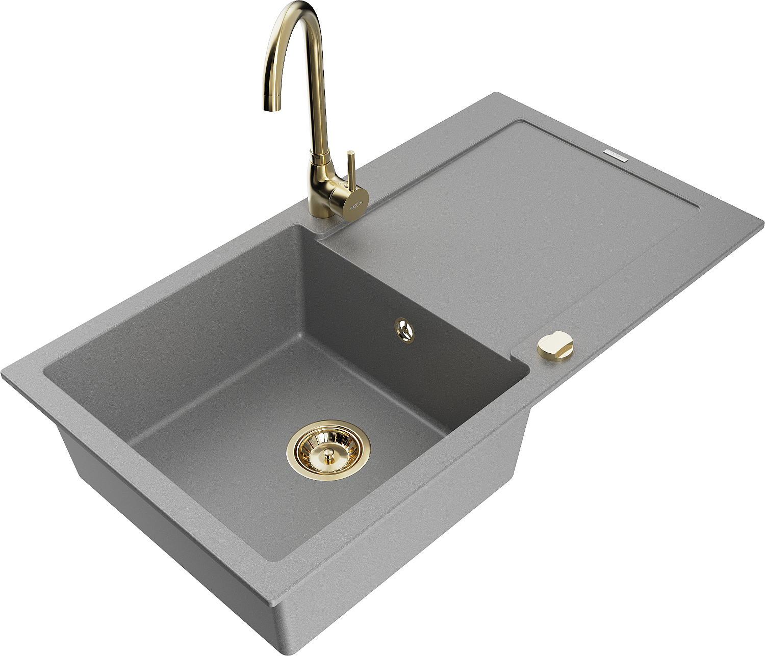 Mexen Leo egytálcás gránit mosogató csepegtetővel és Telma konyhai csapteleppel, szürke - 6501-71-670200-50