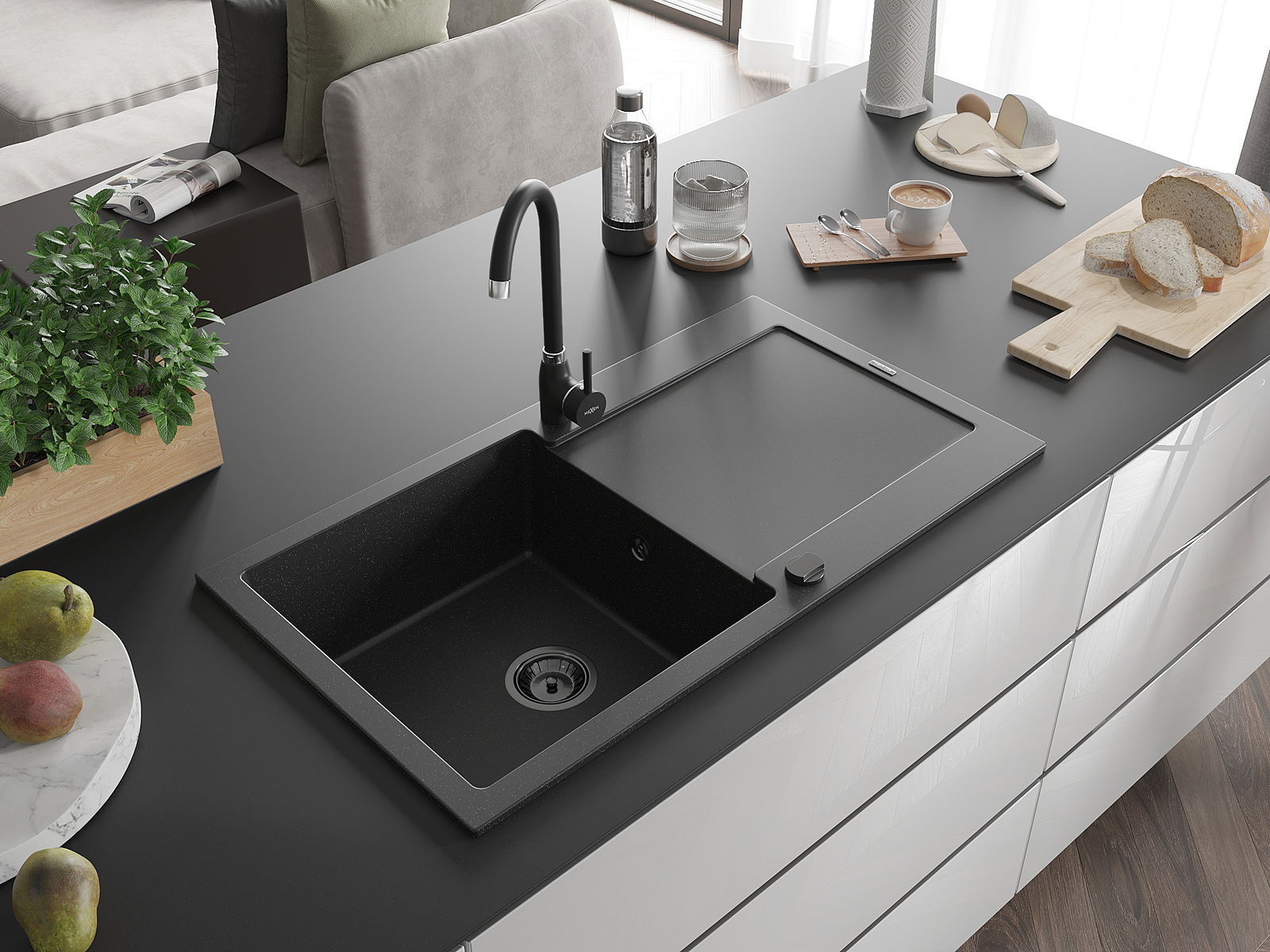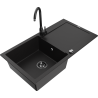 Mexen Leo egykamrás gránit mosogatótálca csepegtetővel és Telma konyhai csapteleppel, fekete/ezüst metál - 6501-73-670200-70-B