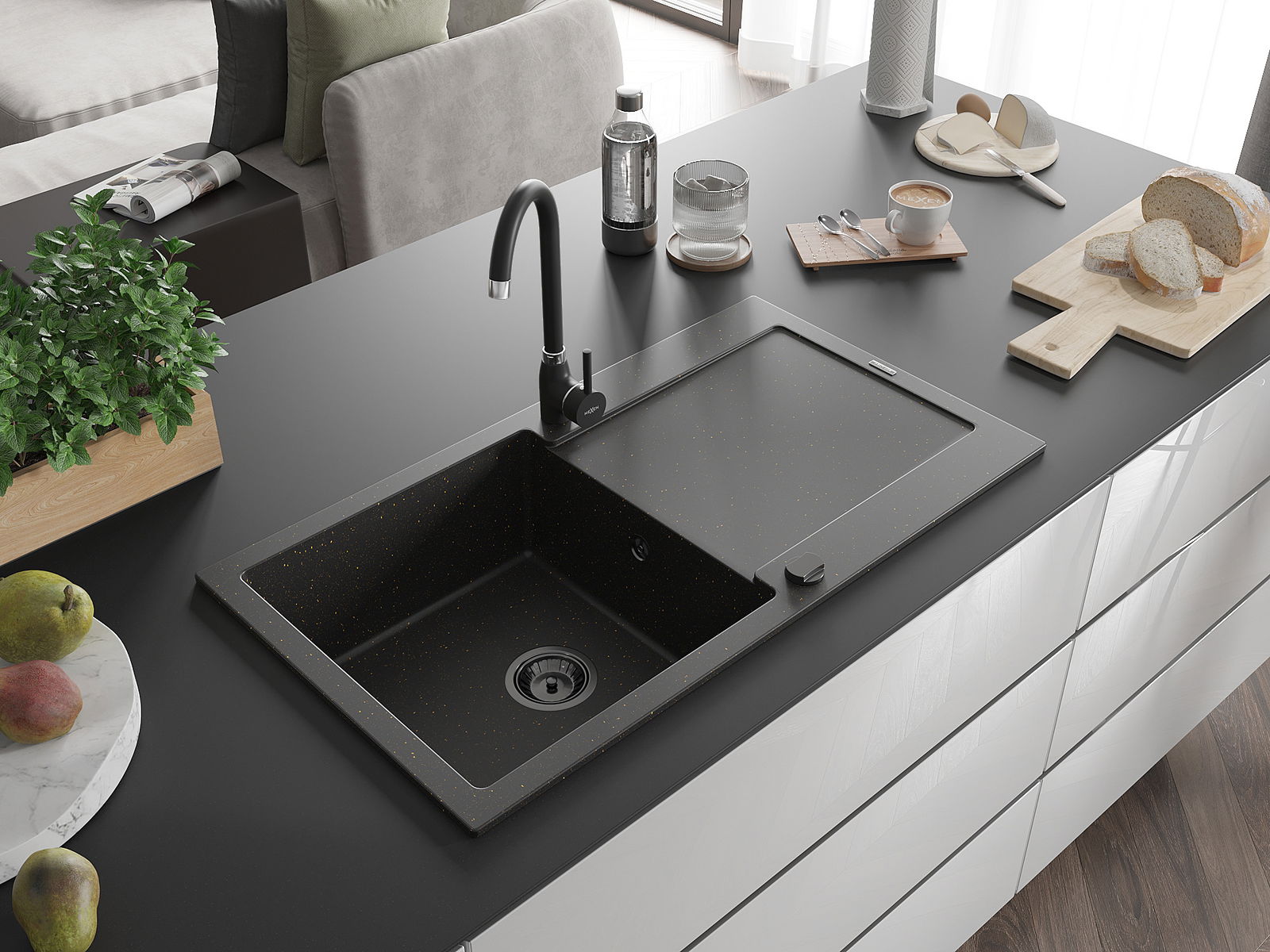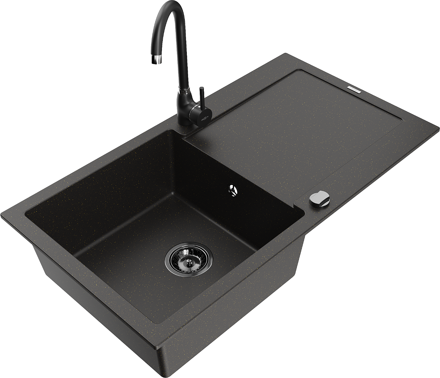 Mexen Leo egykamrás gránit mosogató csepegtetővel és Telma konyhai csappal, fekete/arany metál - 6501-75-670200-70-B