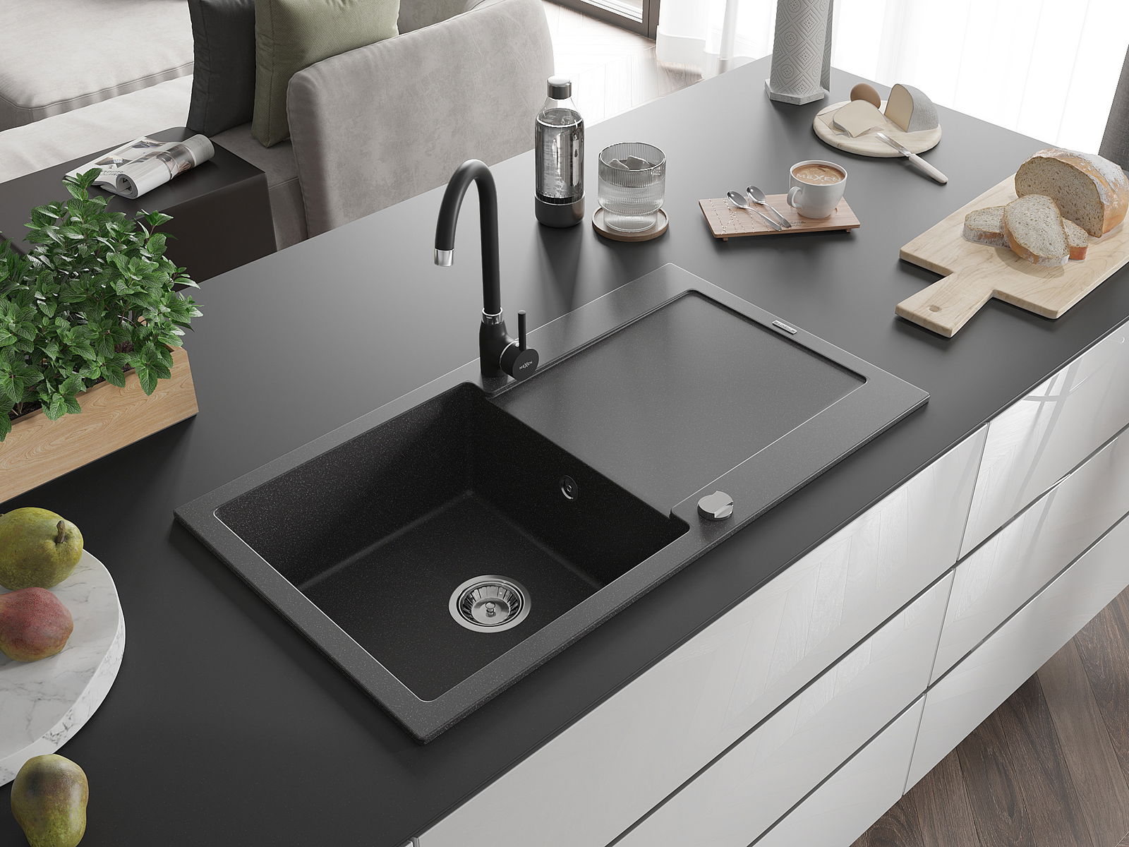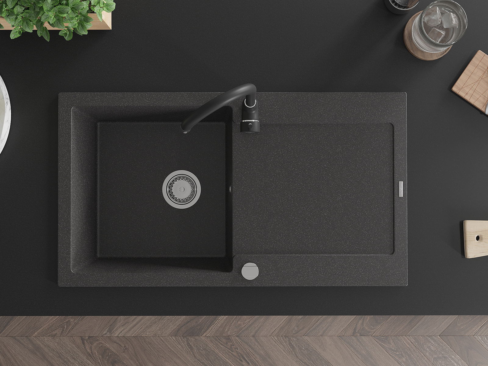 A mosogató kiváló minőségű gránitból készül. Ez egy elegáns és mindenekelőtt minden konyhához praktikus kiegészítés, stílusától függetlenül. A kiváló minőségű és a gránit tartósság biztosítja a sok éves használatát.