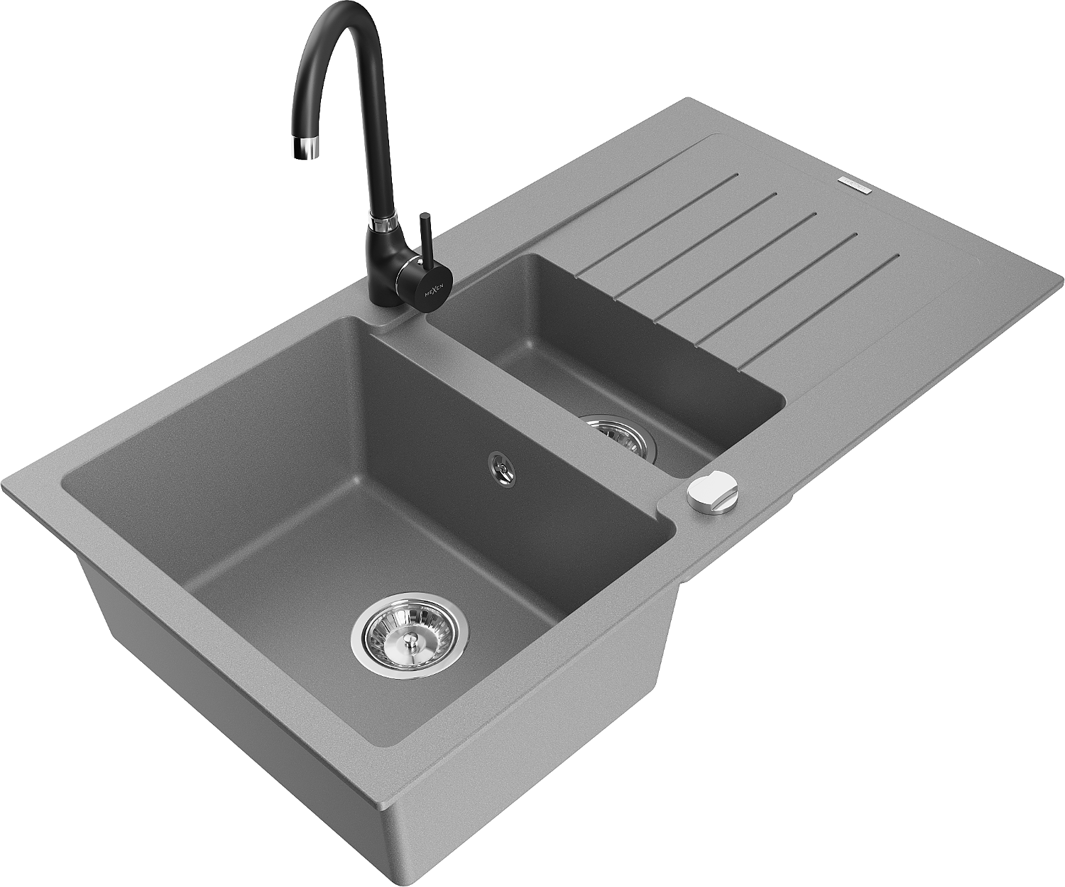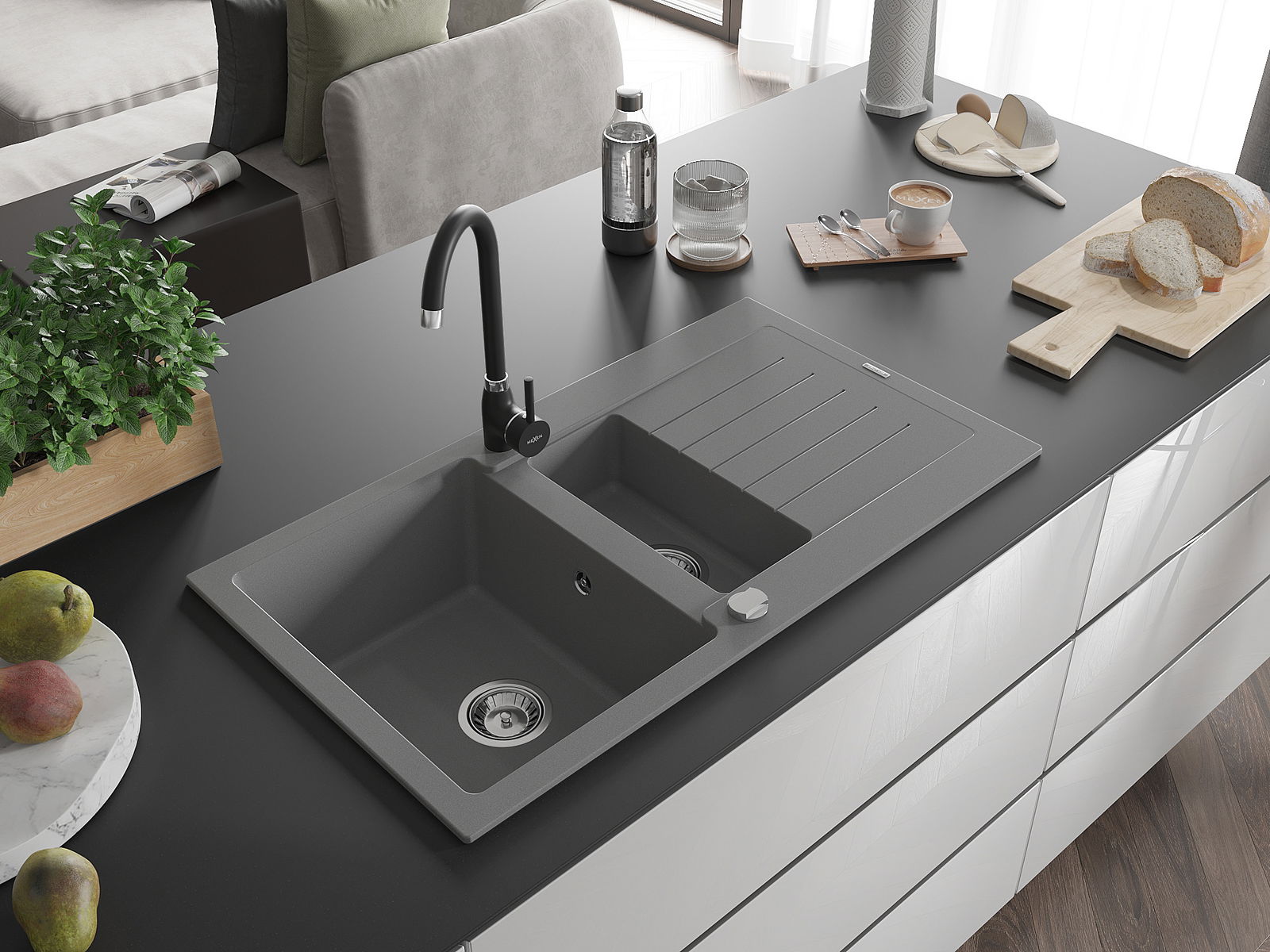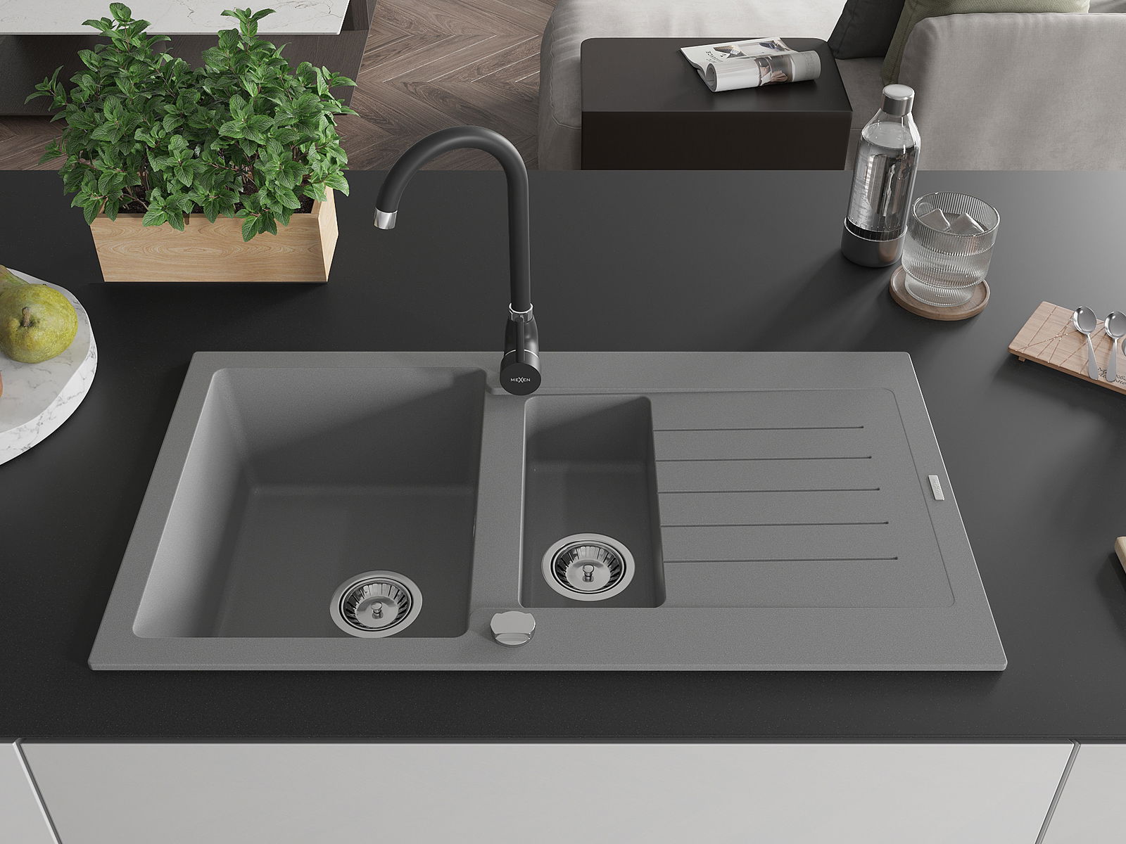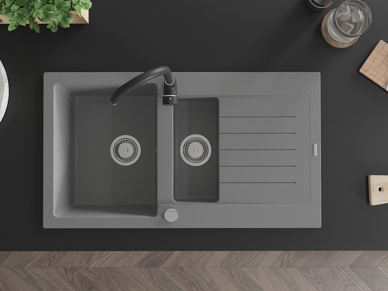 Mexen Matias 1,5-medencés gránit mosogató csepegtetővel és Telma konyhai csapteleppel, szürke - 6502-71-670200-70