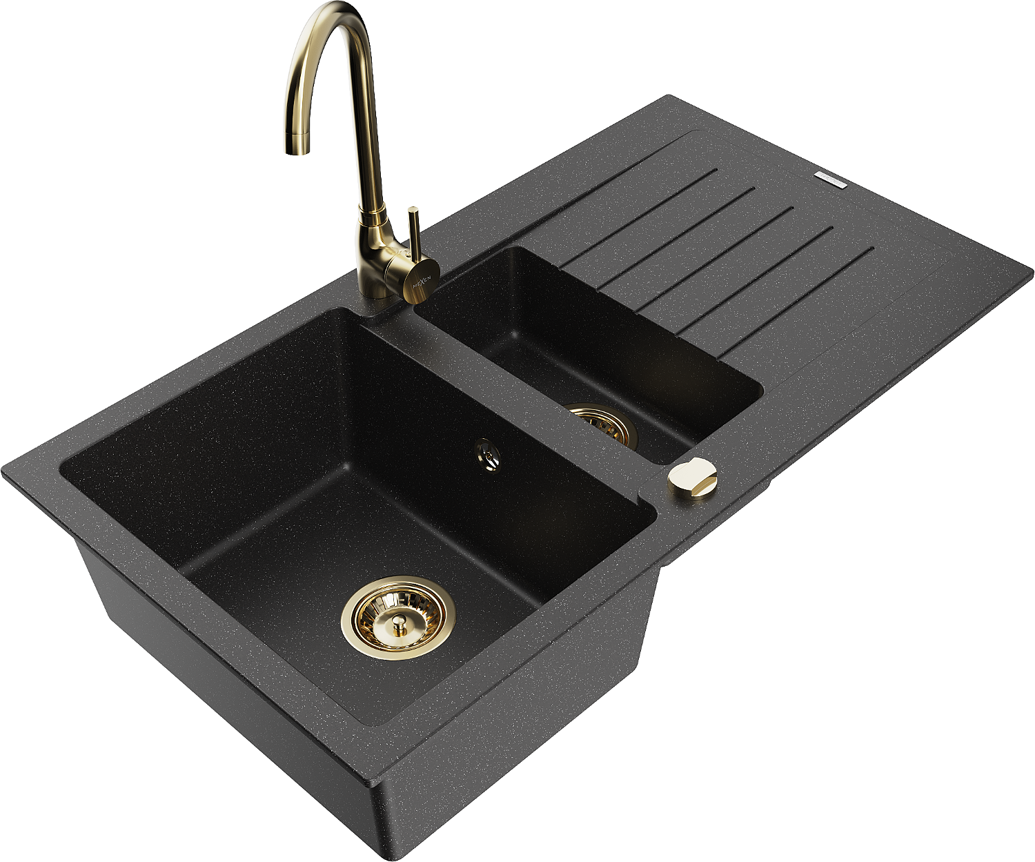 Mexen Matias gránit mosogató 1,5 medencés csepegtetővel és Telma konyhai csapteleppel, fekete/ezüst - 6502-73-670200-50