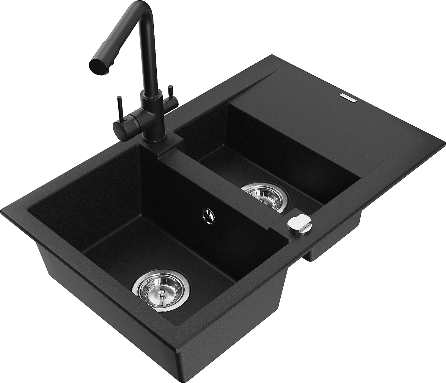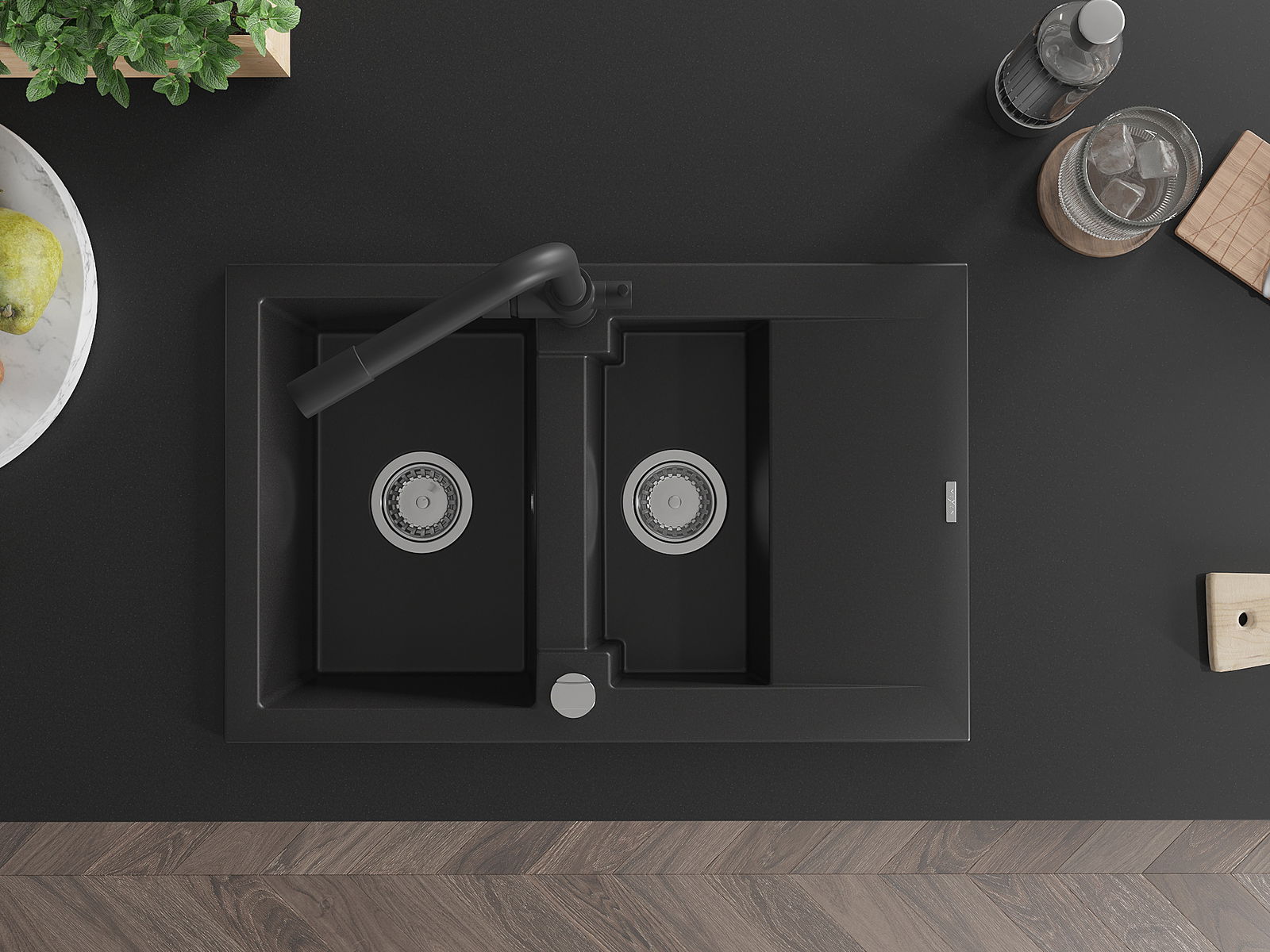 Mexen Gaspar gránit mosogató 1,5-medencés csepegtetővel és Duero konyhai csappal, fekete - 6507-77-671600-70