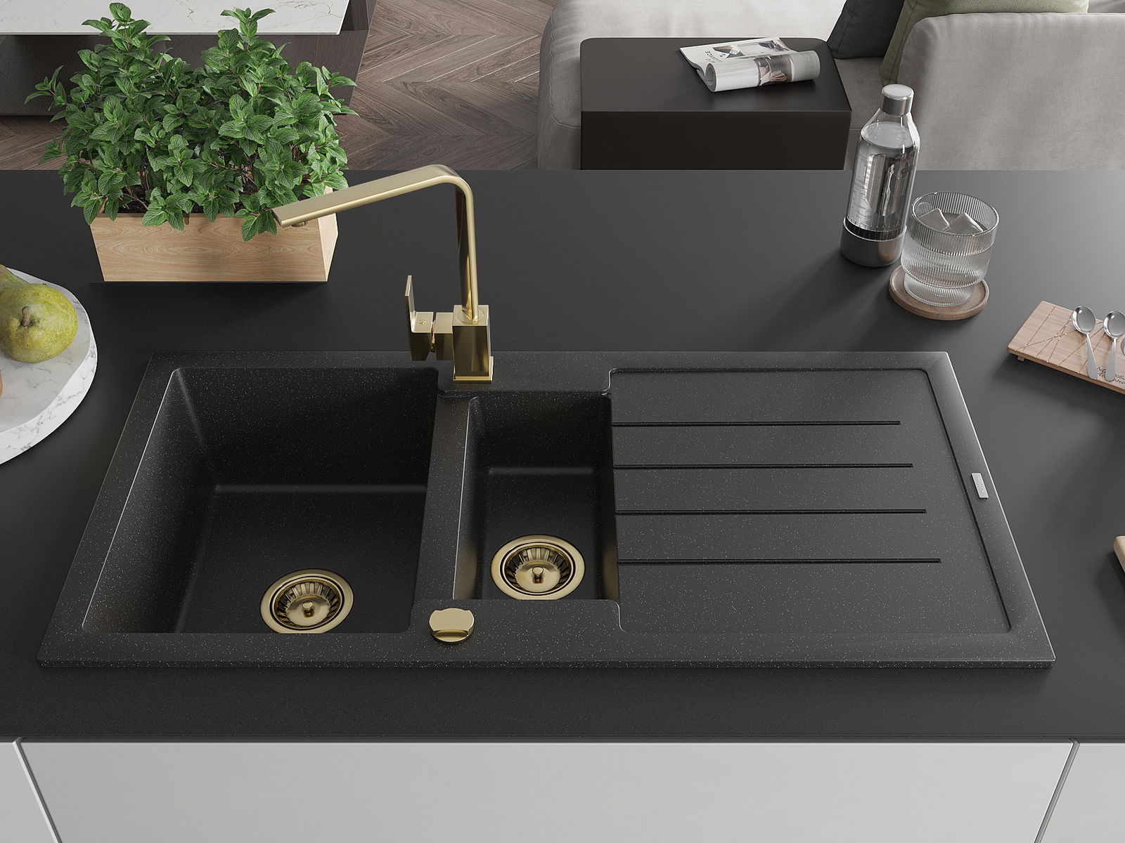 A mosogató 2 összekapcsolt lyukkal rendelkezik, amelynek átmérője 35 mm, önmagában. Felhasználhatók többek között Olyan folyékony adagoló rögzítéséhez, amely kiküszöböli a műanyag palackok jelenlétét a konyhában, és elegáns kivitelben adja meg.