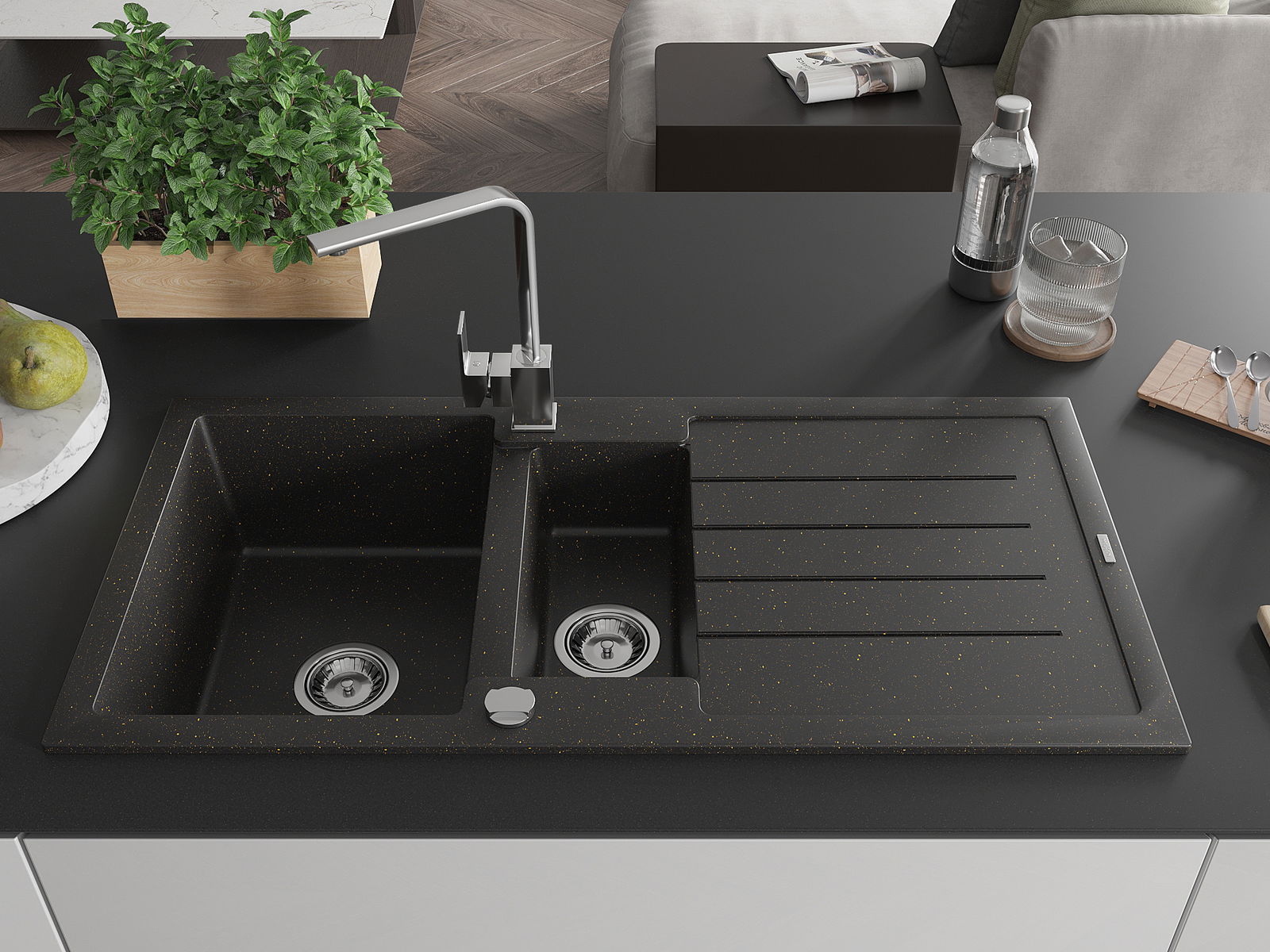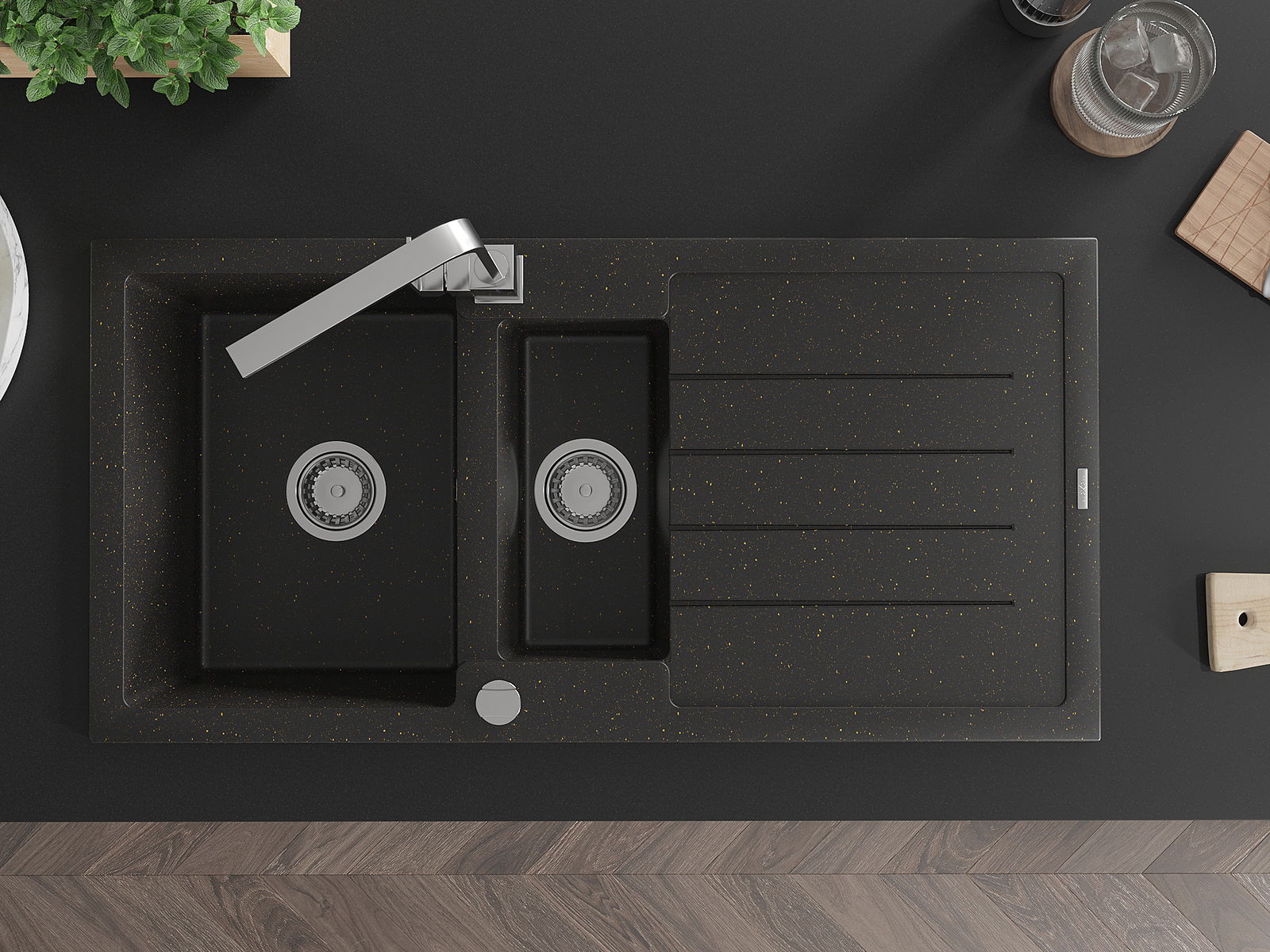 A mosogató magas minőségű gránitból készült. Elegáns, de mindenekelőtt praktikus kiegészítője minden konyhának, függetlenül annak stílusától. A gránit magas minősége és tartóssága hosszú távú használatot biztosít.