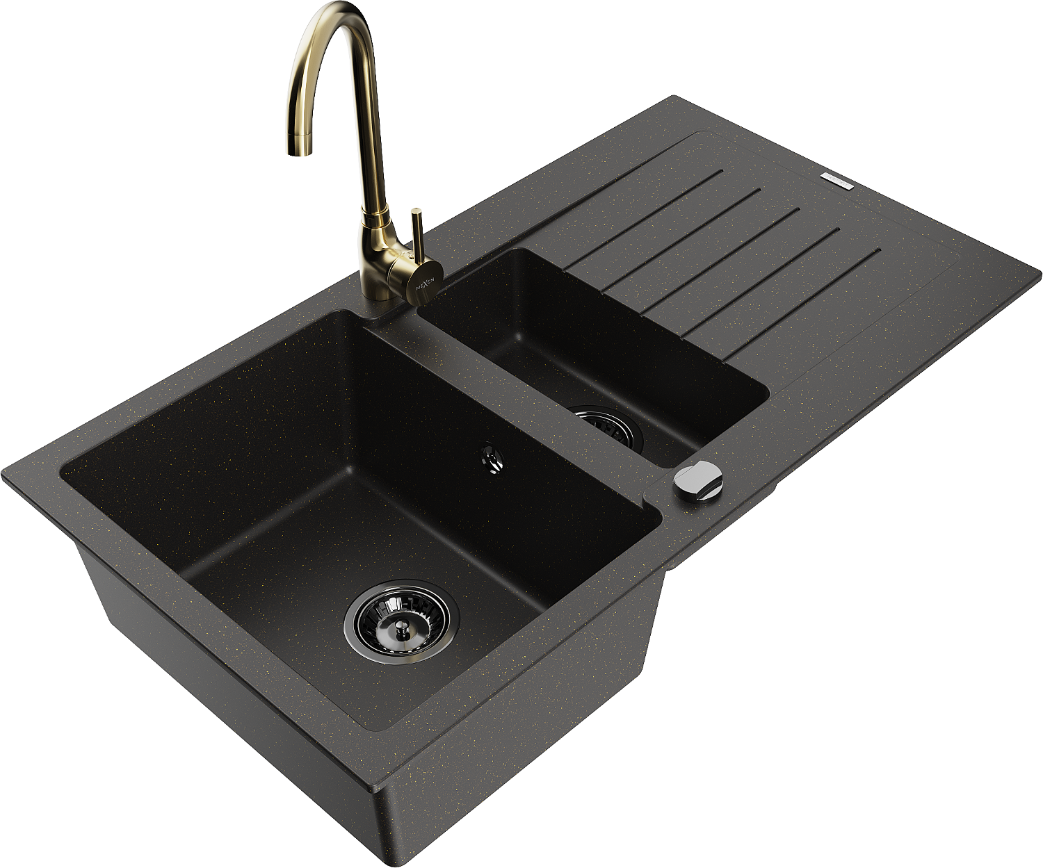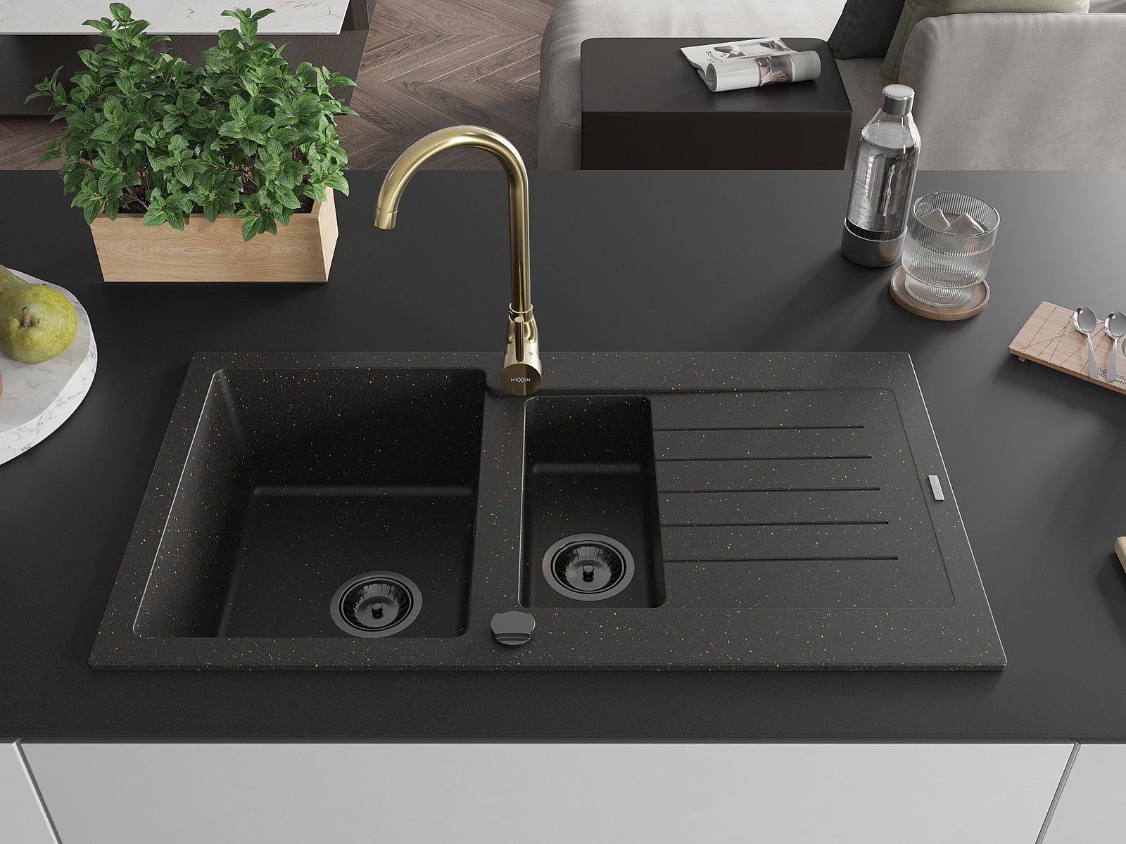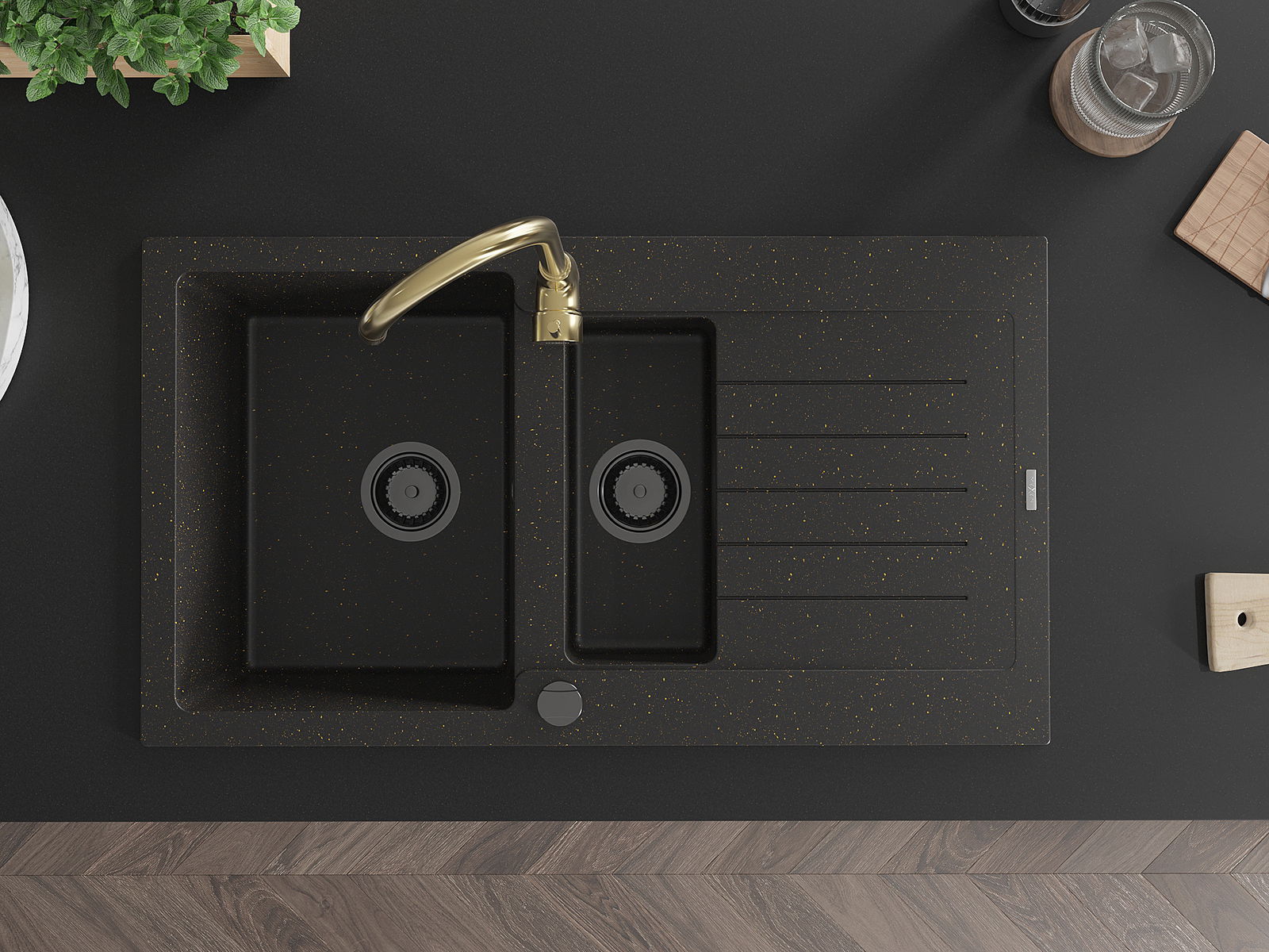 Mexen Matias 1,5-medencés gránit mosogató csepegtetővel és konyhai csapteleppel Telma, fekete/arany - 6502-75-670200-50-B