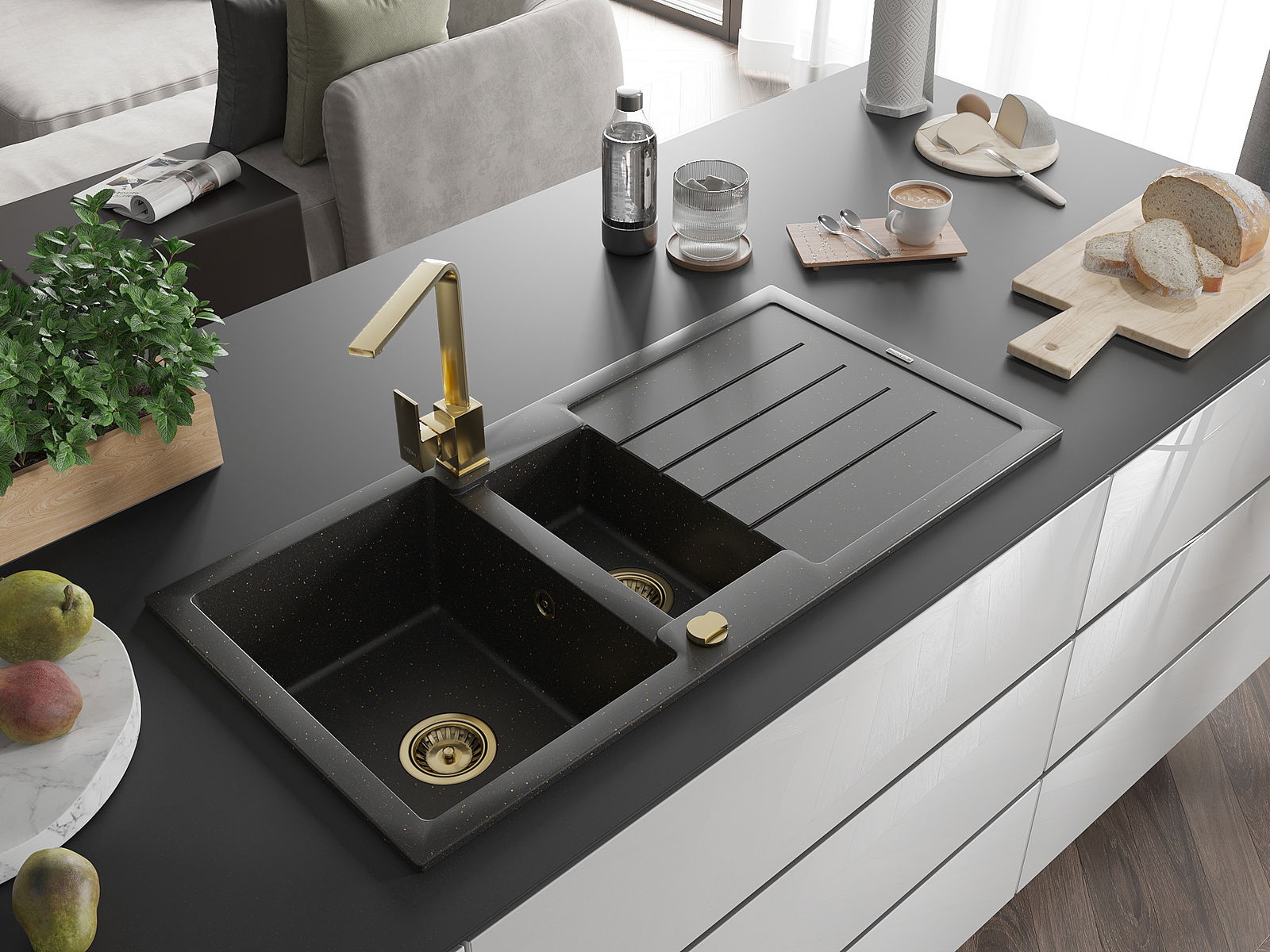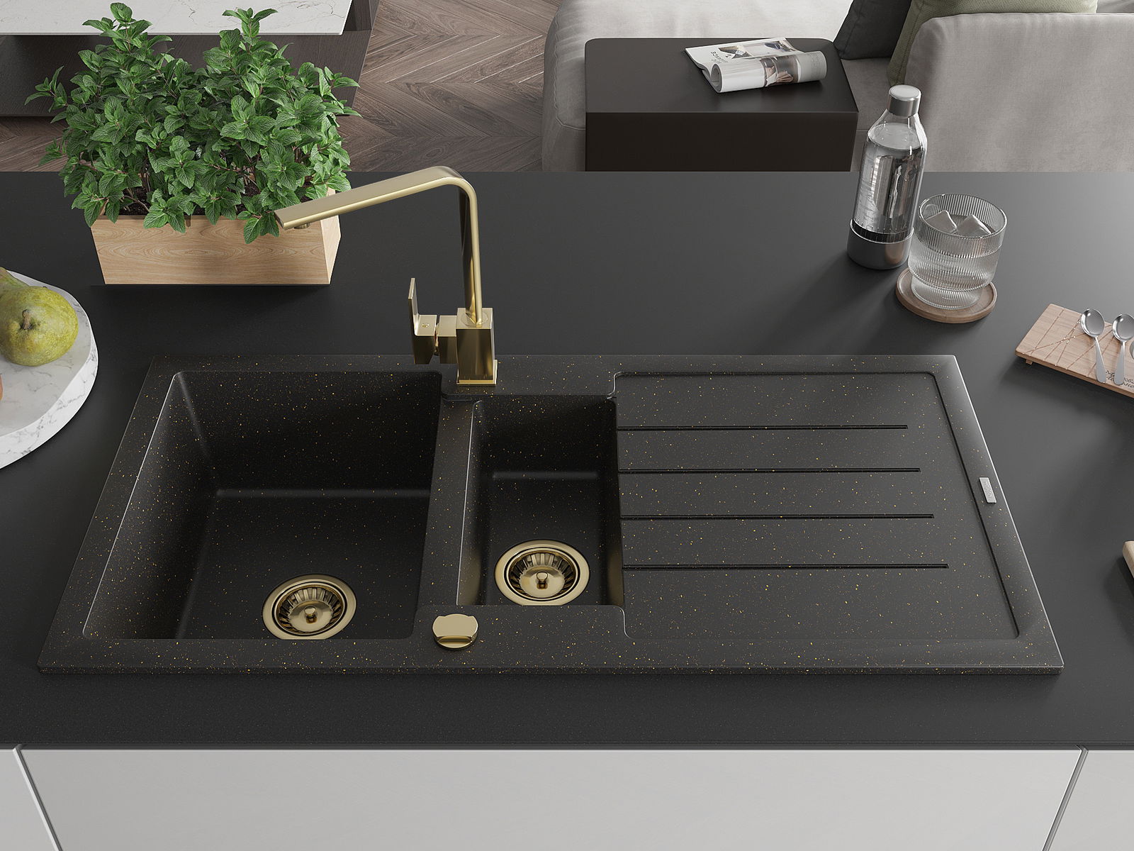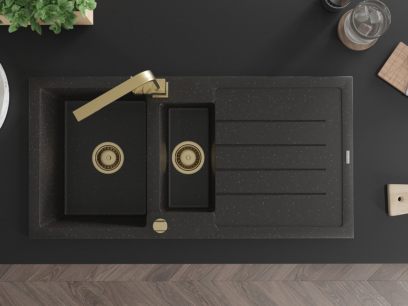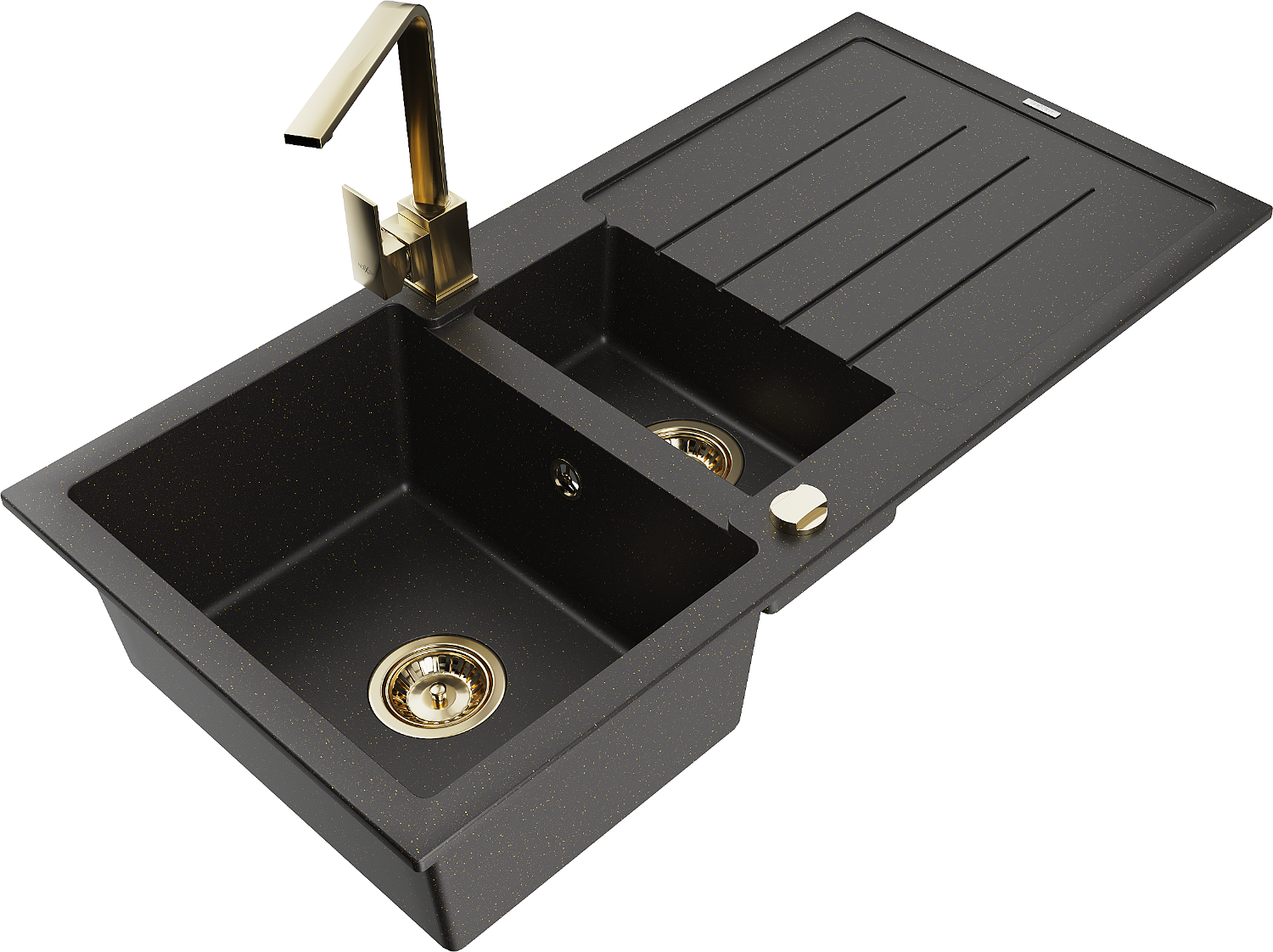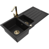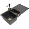 Mexen Andres 1,5 medencés gránit mosogató csepegtetővel és Rita konyhai csapteleppel, fekete/arany metál