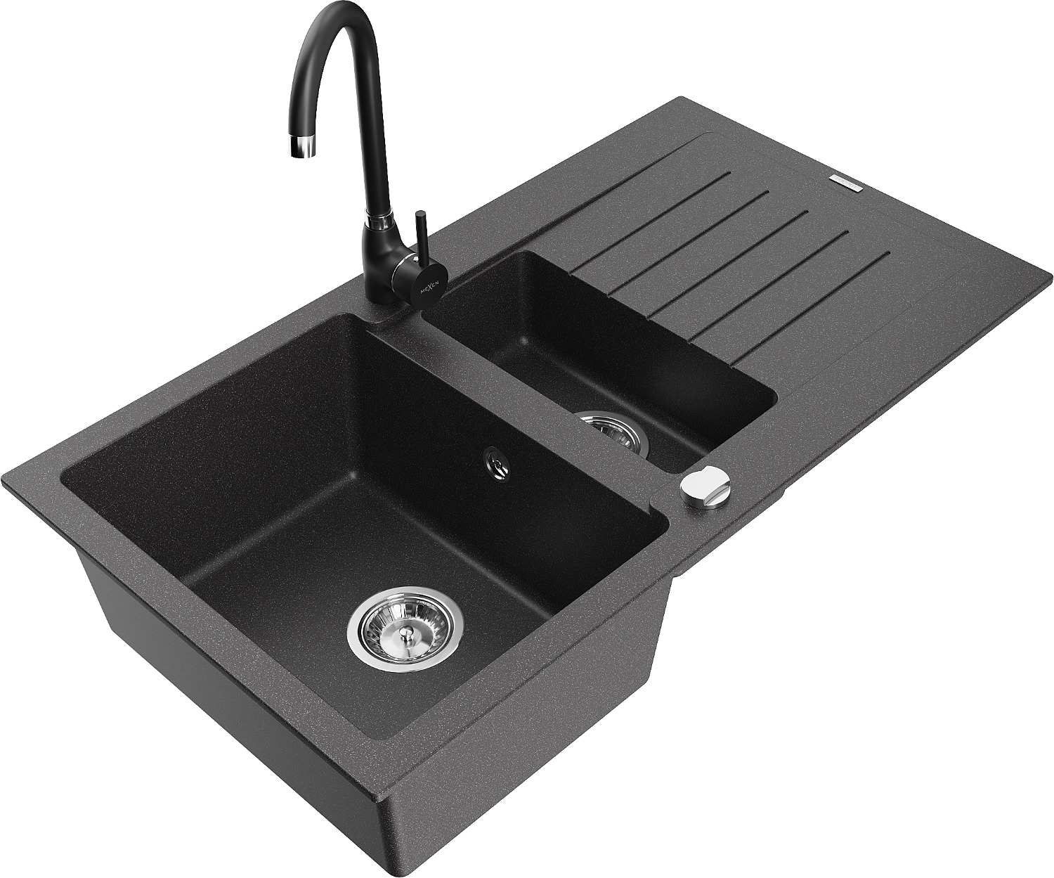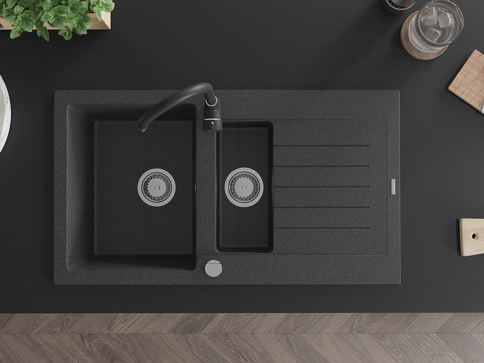 Mexen Matias 1,5 rekeszes gránit mosogató csepegtetővel és Telma konyhai csappal, fekete pettyezett - 6502-76-670200-70