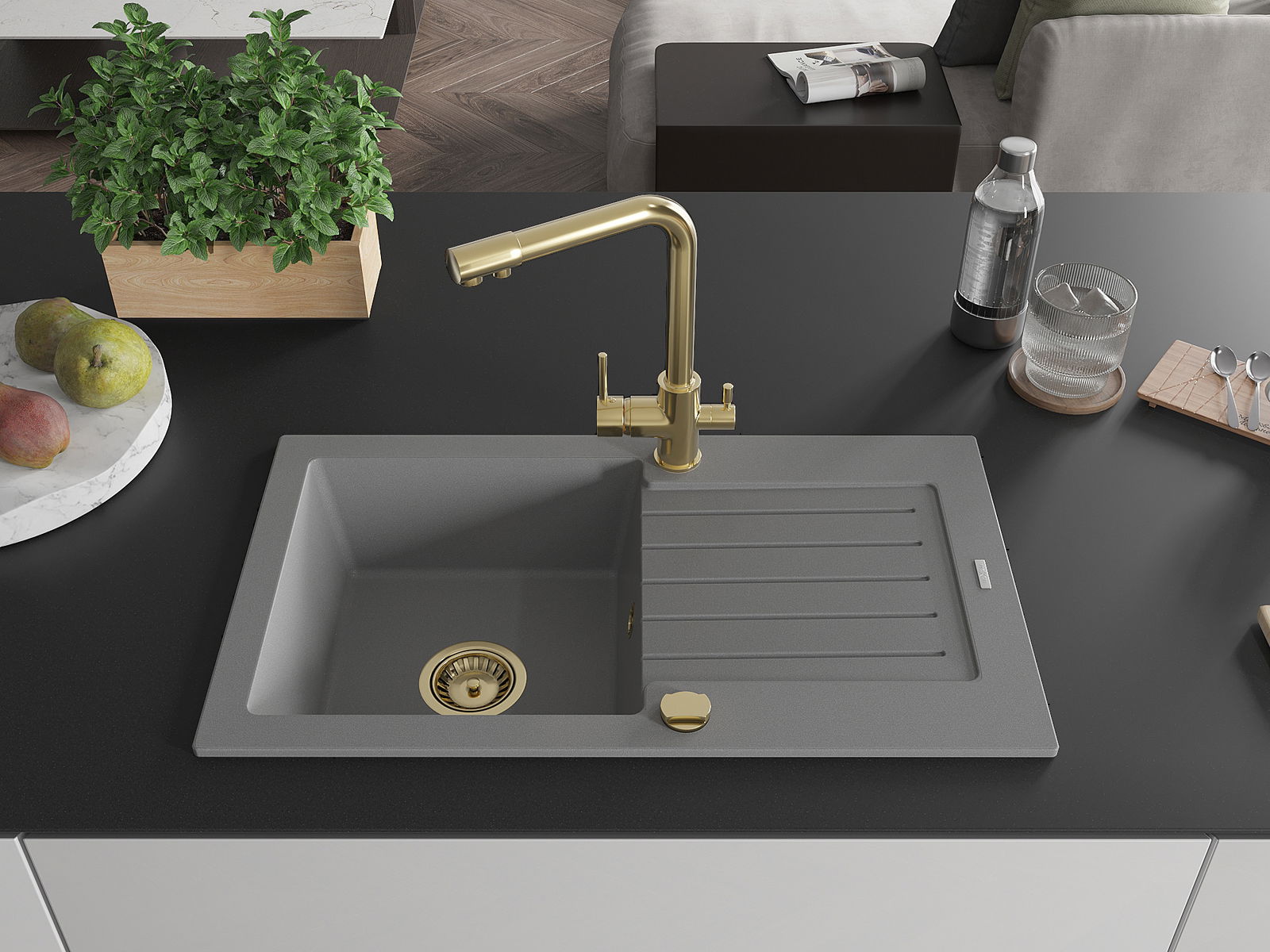 A mosogató magas minőségű gránitból készült. Elegáns, de mindenekelőtt praktikus kiegészítője minden konyhának, függetlenül annak stílusától. A gránit magas minősége és tartóssága hosszú távú használatot biztosít.