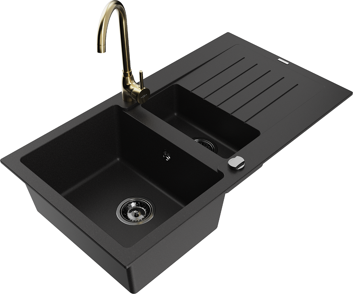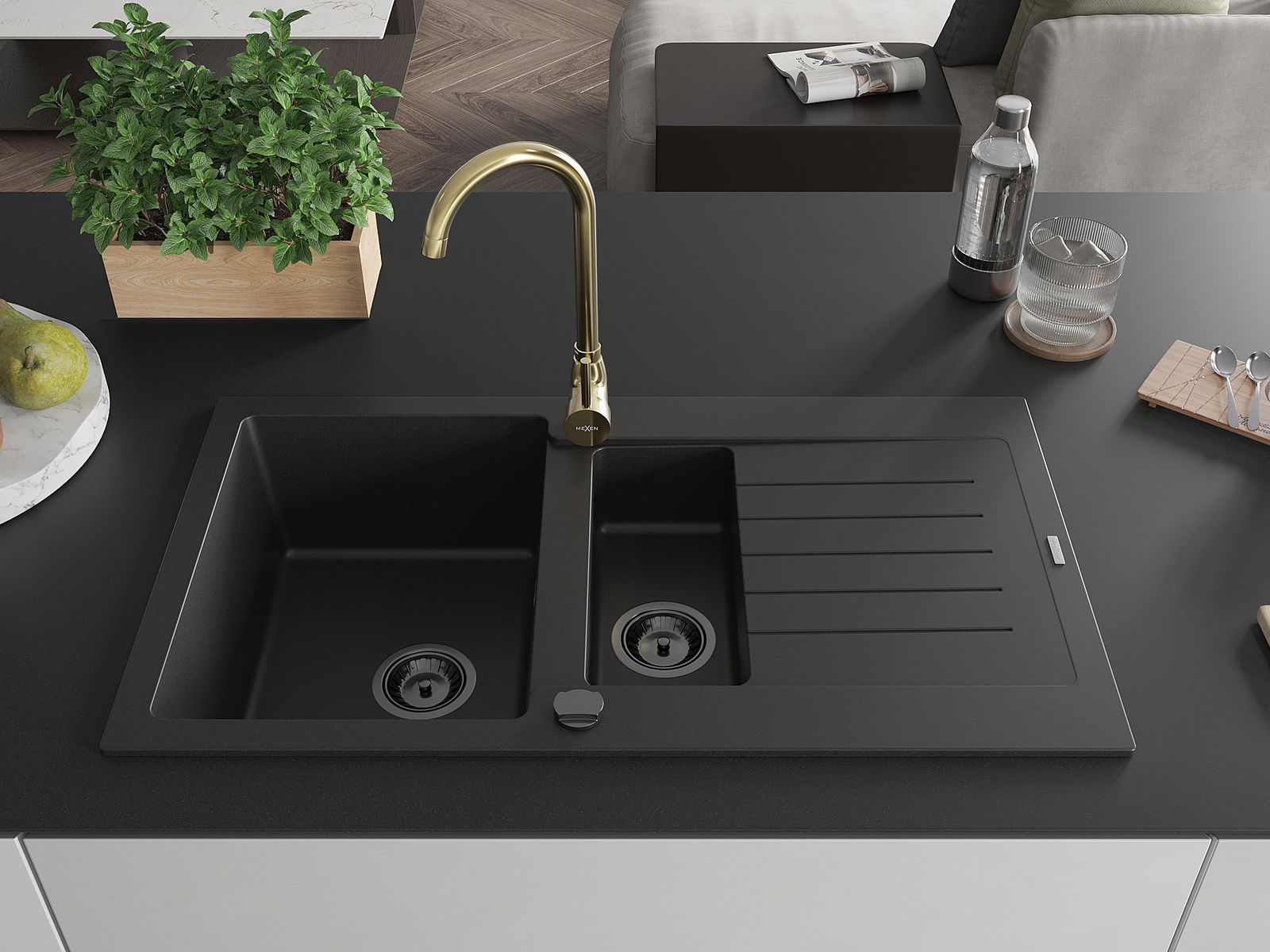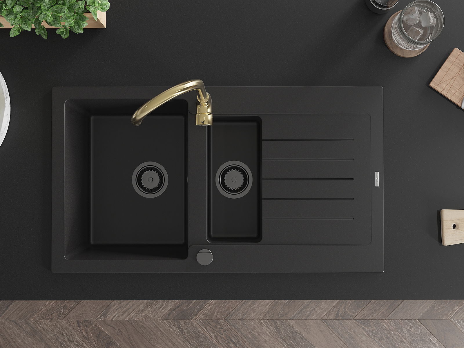 Mexen Matias 1,5-medencés gránit mosogató csepegtetővel és Telma konyhai csappal, fekete - 6502-77-670200-50-B