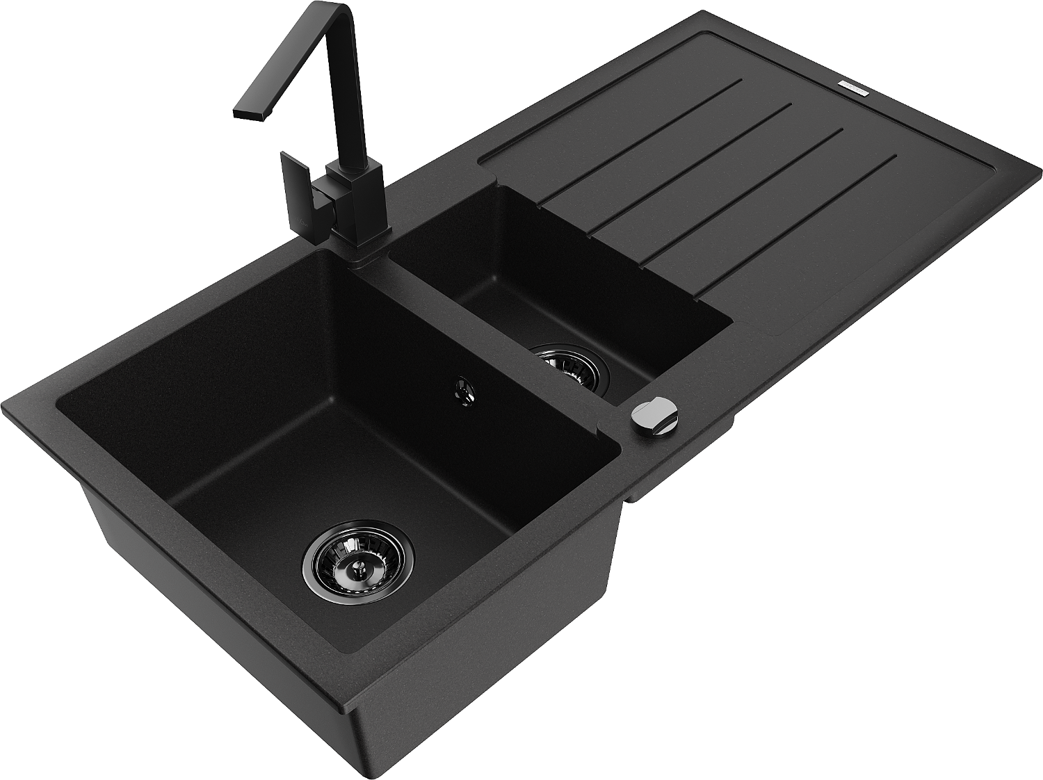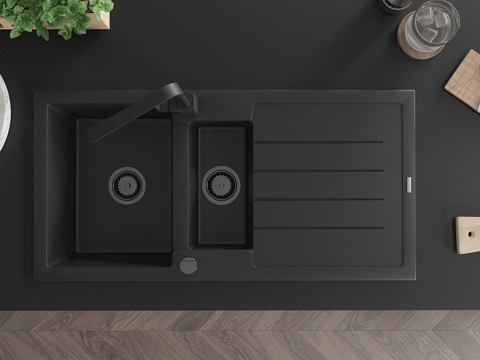 Mexen Andres 1,5 kamrás gránit mosogató csepegtetővel és Rita konyhai csapteleppel, fekete - 6515-77-670300-70-B
