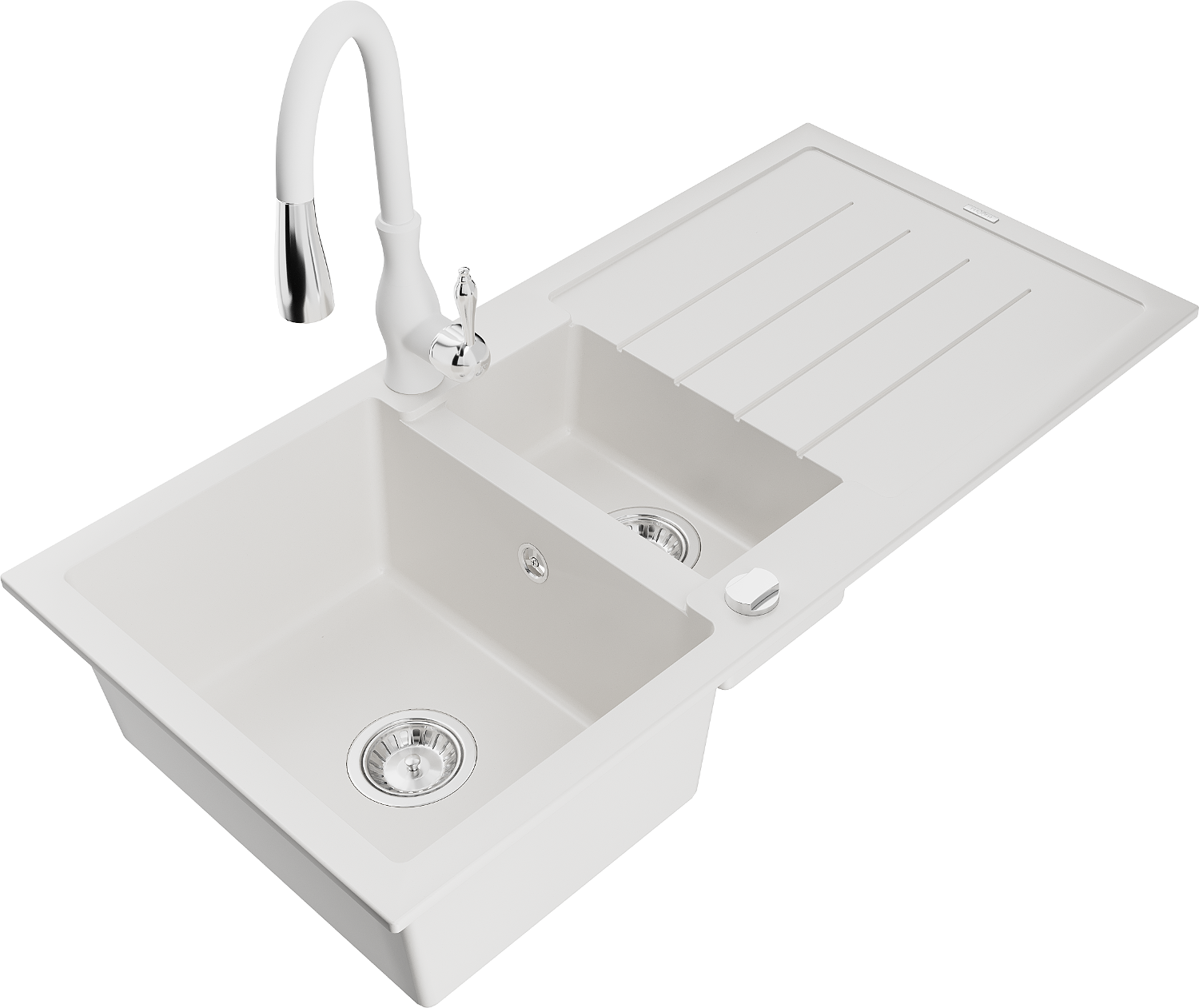 Mexen Andres 1,5 kamrás gránit mosogató csepegtetővel és Savita konyhai csapteleppel, fehér - 6515-20-672601-20
