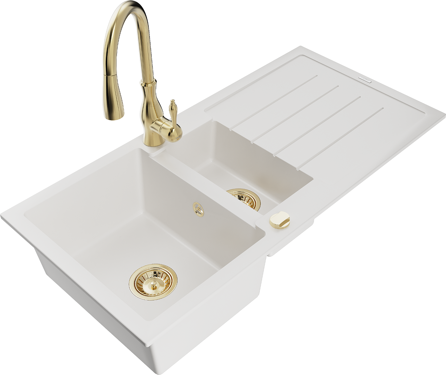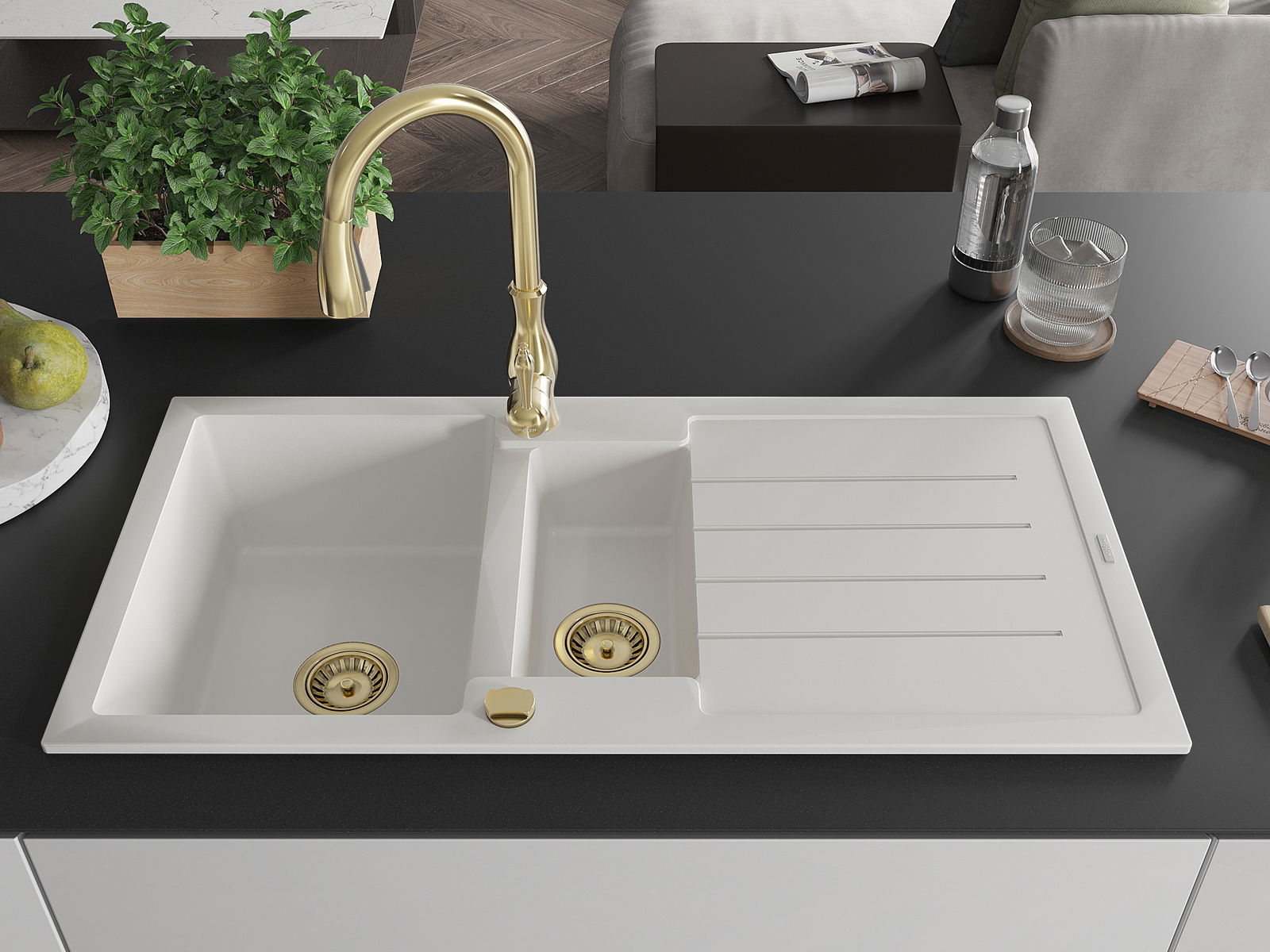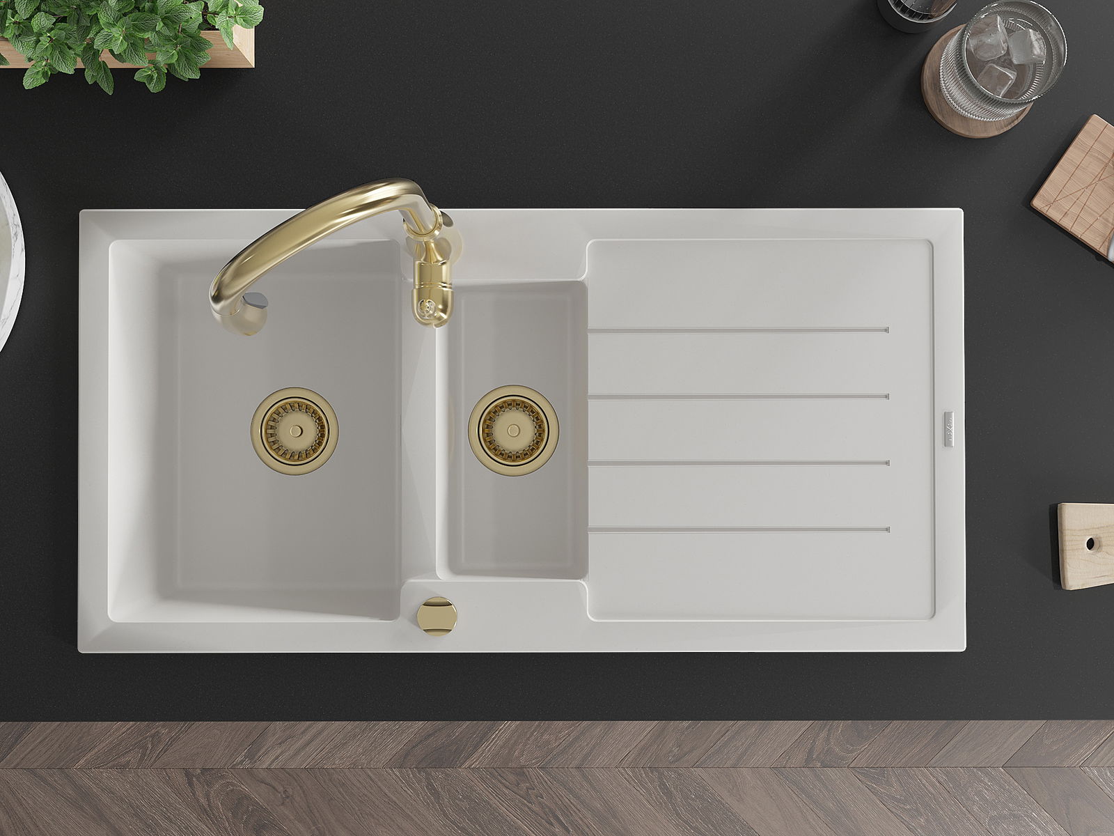 Mexen Andres 1,5 rekeszes gránit mosogató csepegtetővel és Savita konyhai csapteleppel, fehér - 6515-20-672601-50