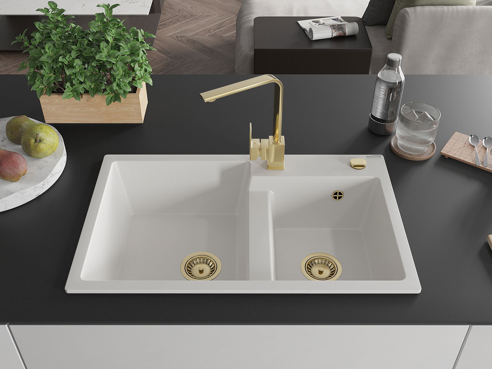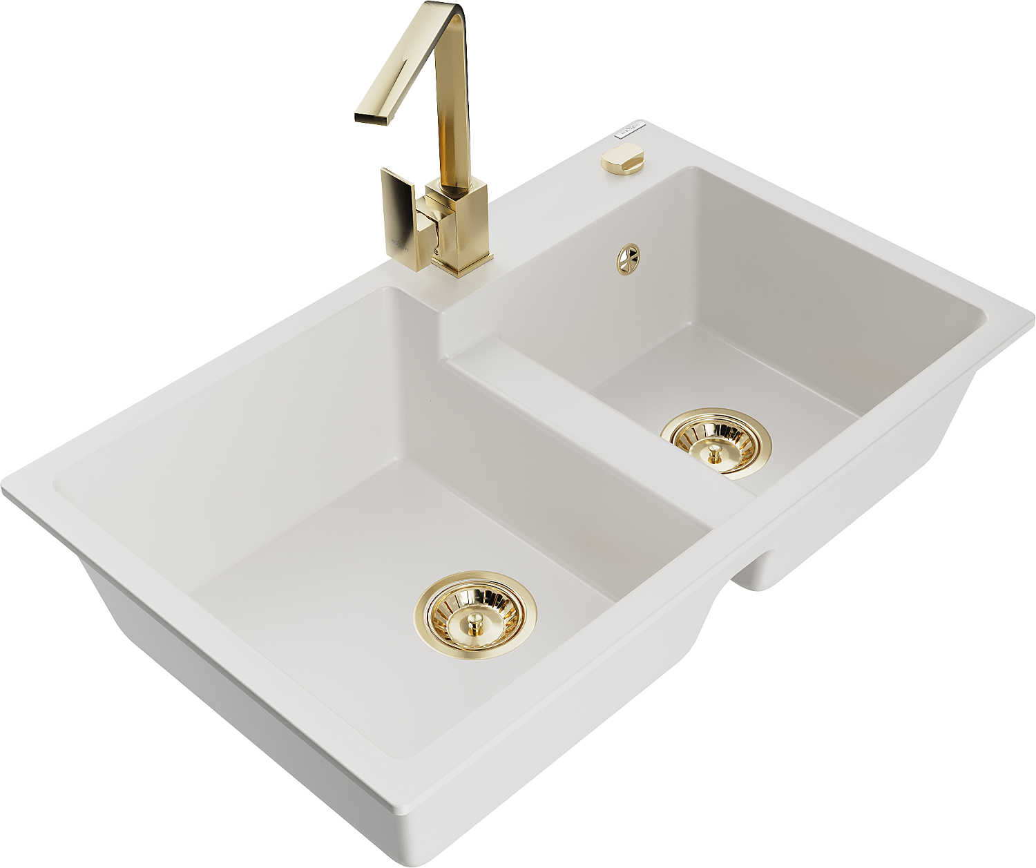 Mexen Tomas gránit mosogató 2-medencés Rita konyhai csapteleppel, fehér - 6516-20-670300-50