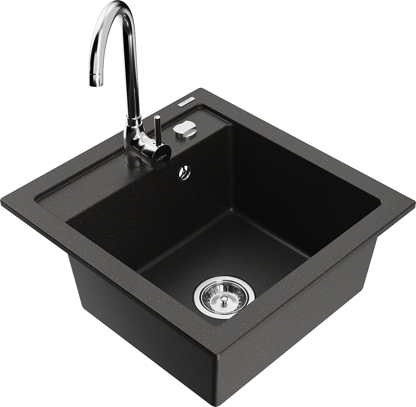 Mexen Vito 1 rekeszes gránit mosogató Telma konyhai csappal, fekete/arany metál - 6503-75-670200-00