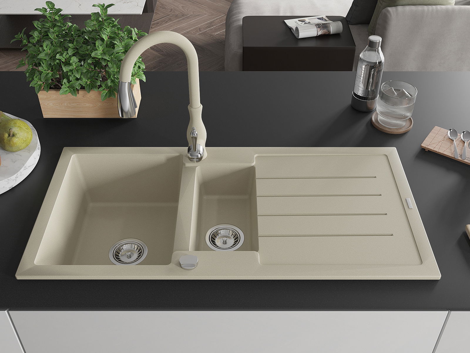 A mosogató kiváló minőségű gránitból készül. Ez egy elegáns és mindenekelőtt minden konyhához praktikus kiegészítés, stílusától függetlenül. A kiváló minőségű és a gránit tartósság biztosítja a sok éves használatát.