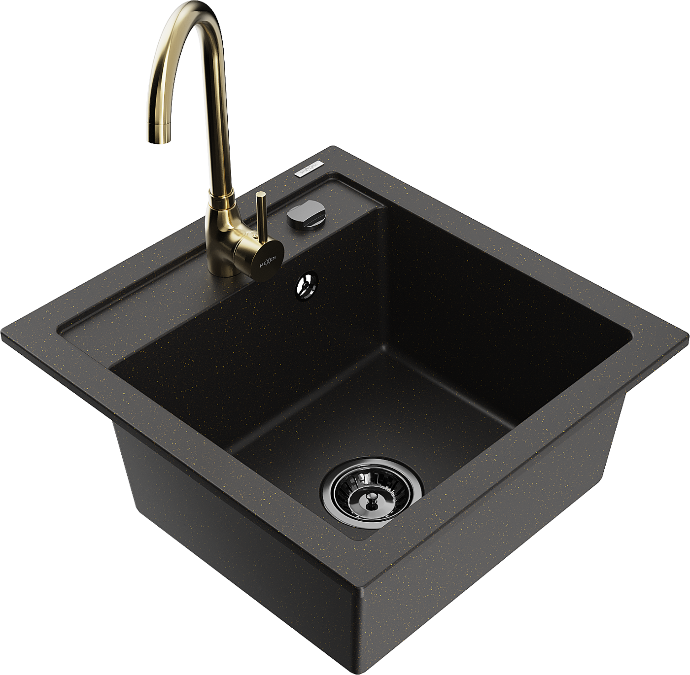 Mexen Vito 1 rekeszes gránit mosogató Telma konyhai csappal, fekete/arany metál - 6503-75-670200-50-B
