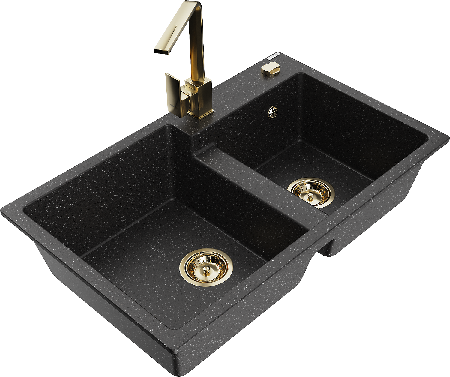 Mexen Tomas gránit 2-medencés mosogató Rita konyhai csappal, fekete/ezüst metál - 6516-73-670300-50