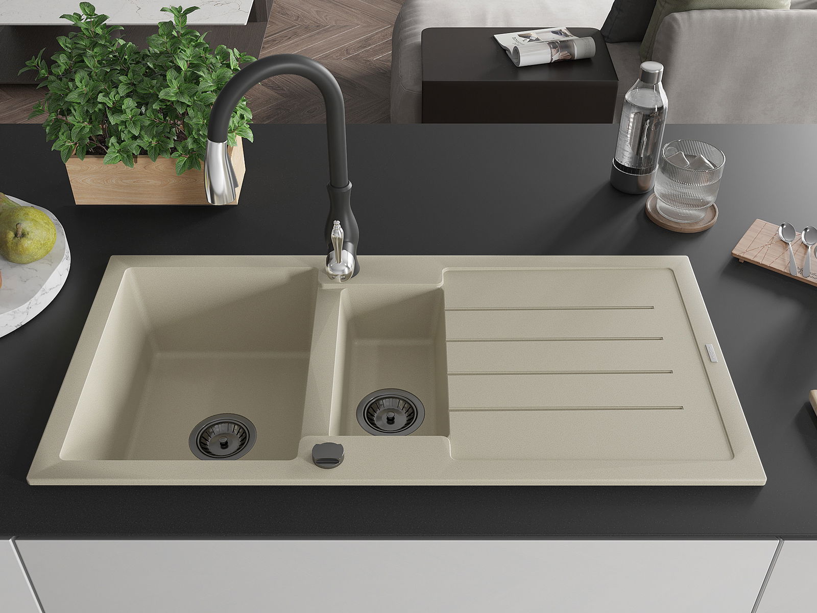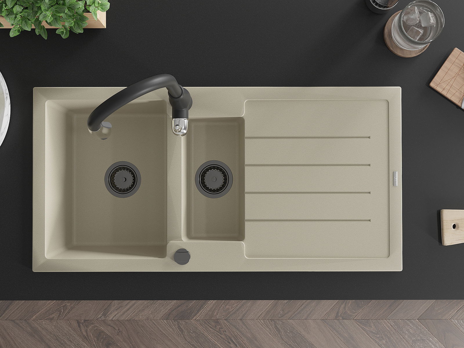 Mexen Andres 1,5-medencés gránit mosogató csepegtetővel és Savita konyhai csapteleppel, bézs - 6515-69-672601-70