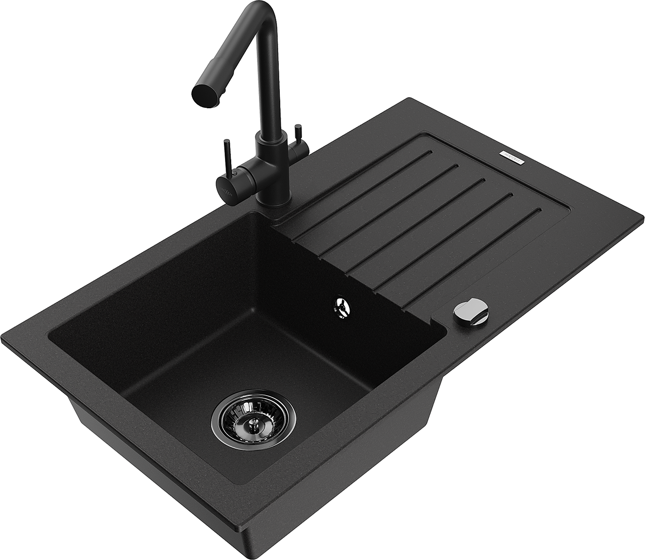 Mexen Pablo 1-medencés, lefolyós gránit mosogató Duero konyhai csapteleppel, fekete - 6510-77-671600-70-B