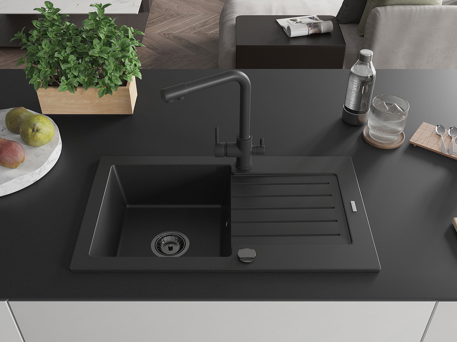 A mosogató magas minőségű gránitból készült. Elegáns, de mindenekelőtt praktikus kiegészítője minden konyhának, függetlenül annak stílusától. A gránit magas minősége és tartóssága hosszú távú használatot biztosít.