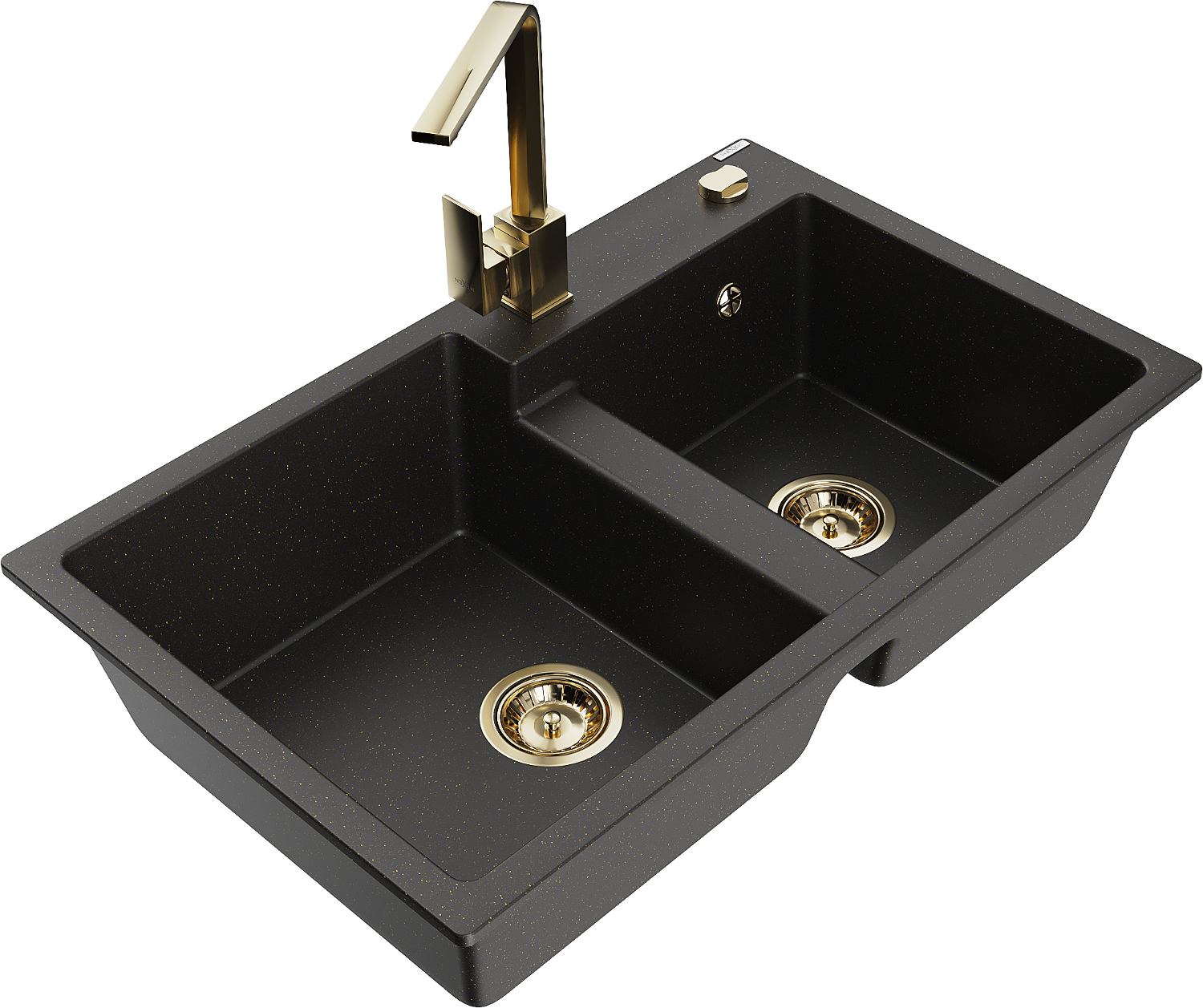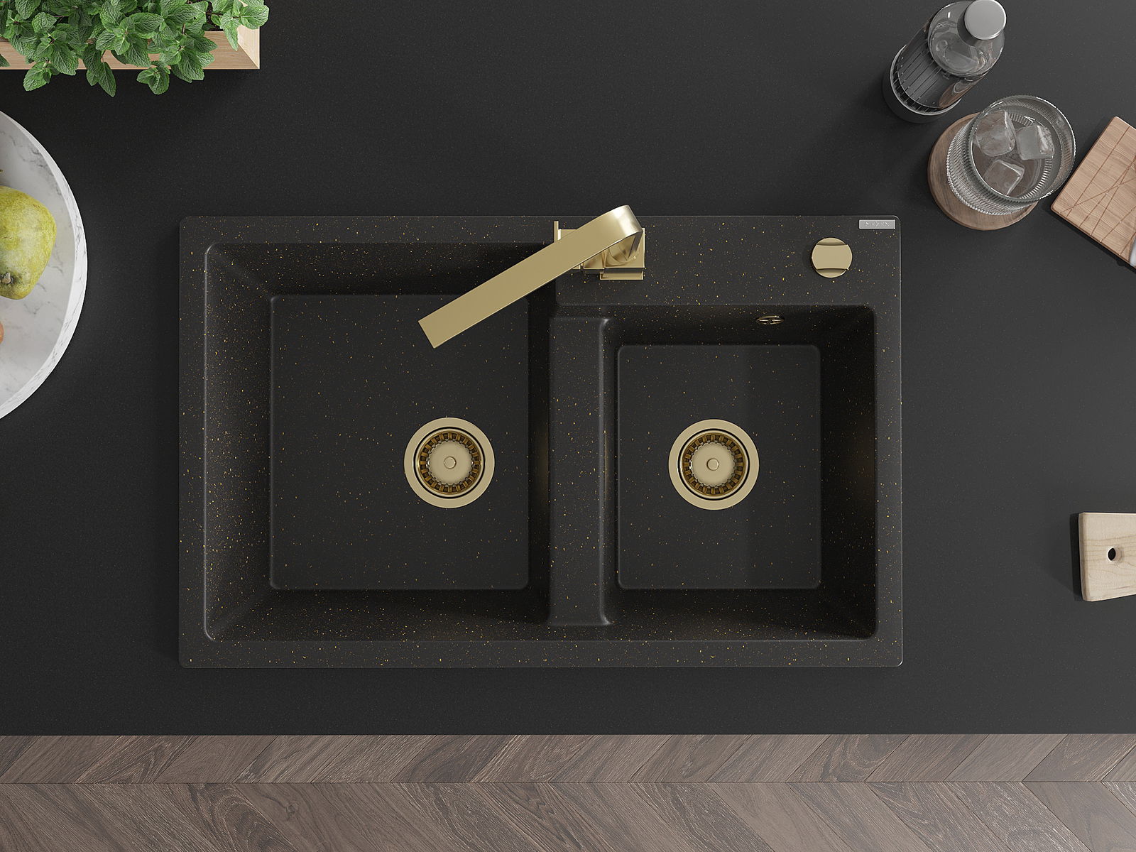 Mexen Tomas gránit kétmedencés mosogató Rita konyhai csapteleppel, fekete/arány metál - 6516-75-670300-50