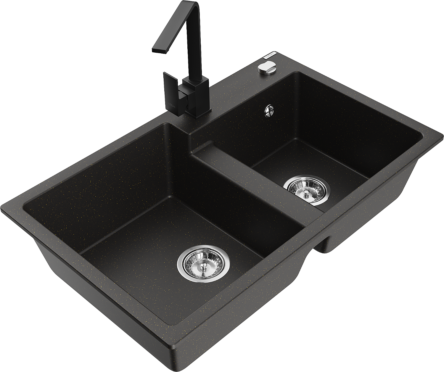 Mexen Tomas gránit mosogató 2 rekeszes Rita konyhai csapteleppel, fekete/arany metál - 6516-75-670300-70
